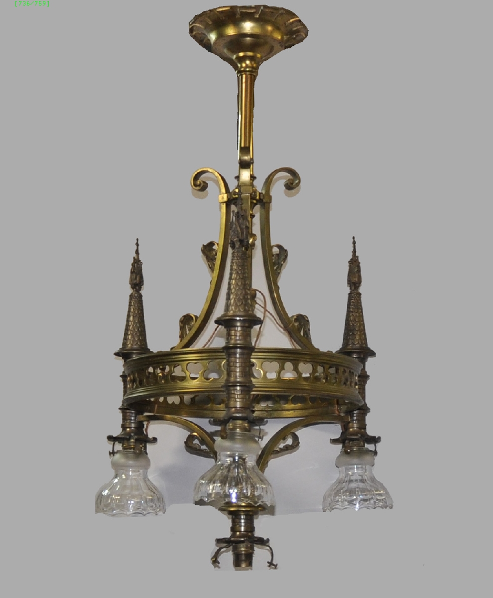 LUSTRE en bronze à quatre lumières. Monture à trois branches ornées de feuillages, soutenant une armature circulaire ajourée de trèfles et de trois pinacles. Petits abats-jours de cristal taillé à facettes.