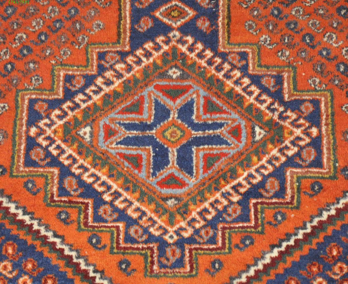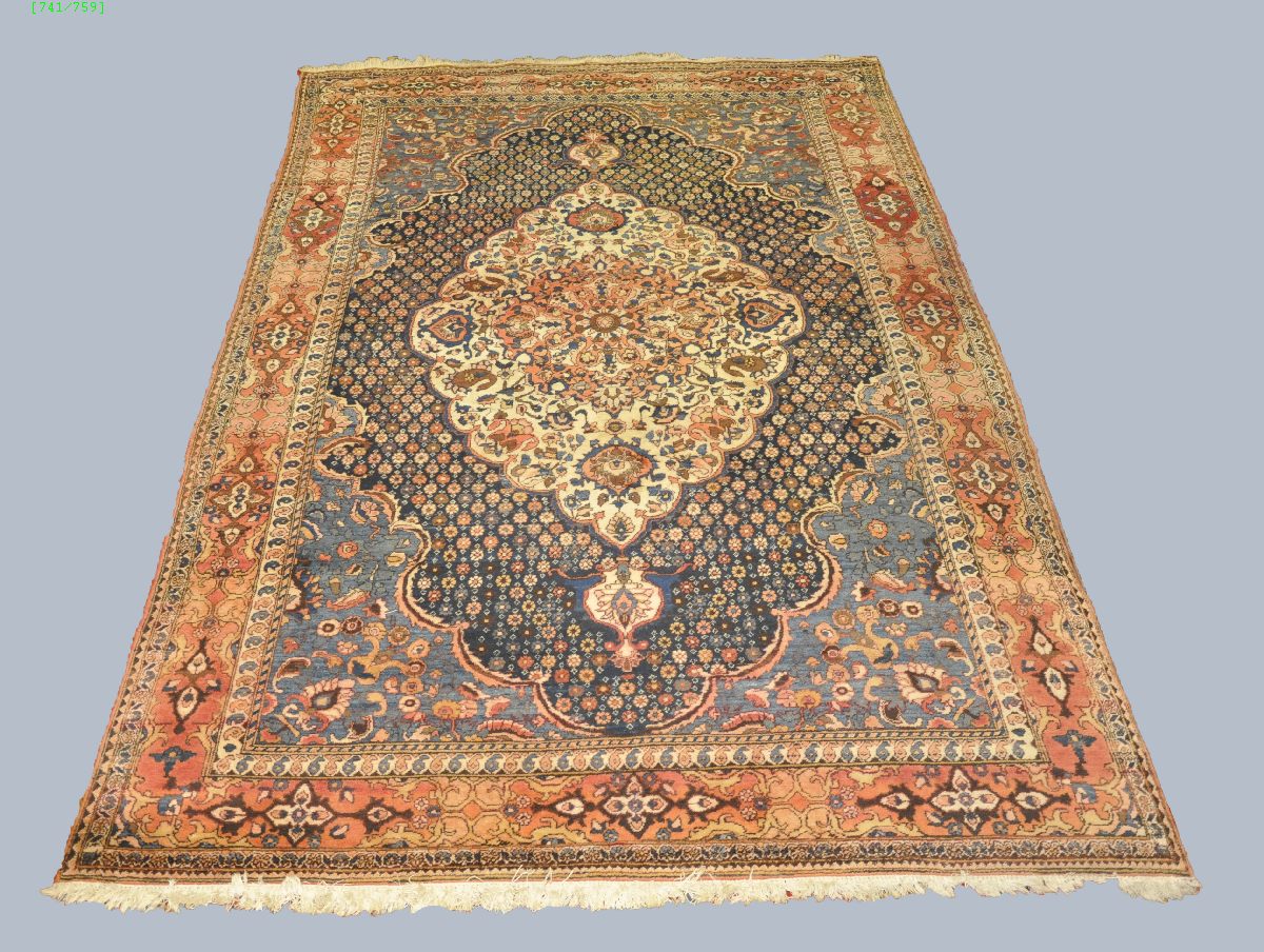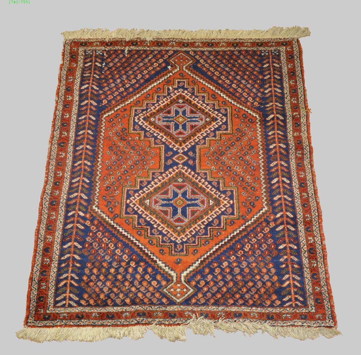 Petit TAPIS en laine, à deux médaillons dans un losange, sur fond orangé. Iran, Senneh? 116 x 90 cm.