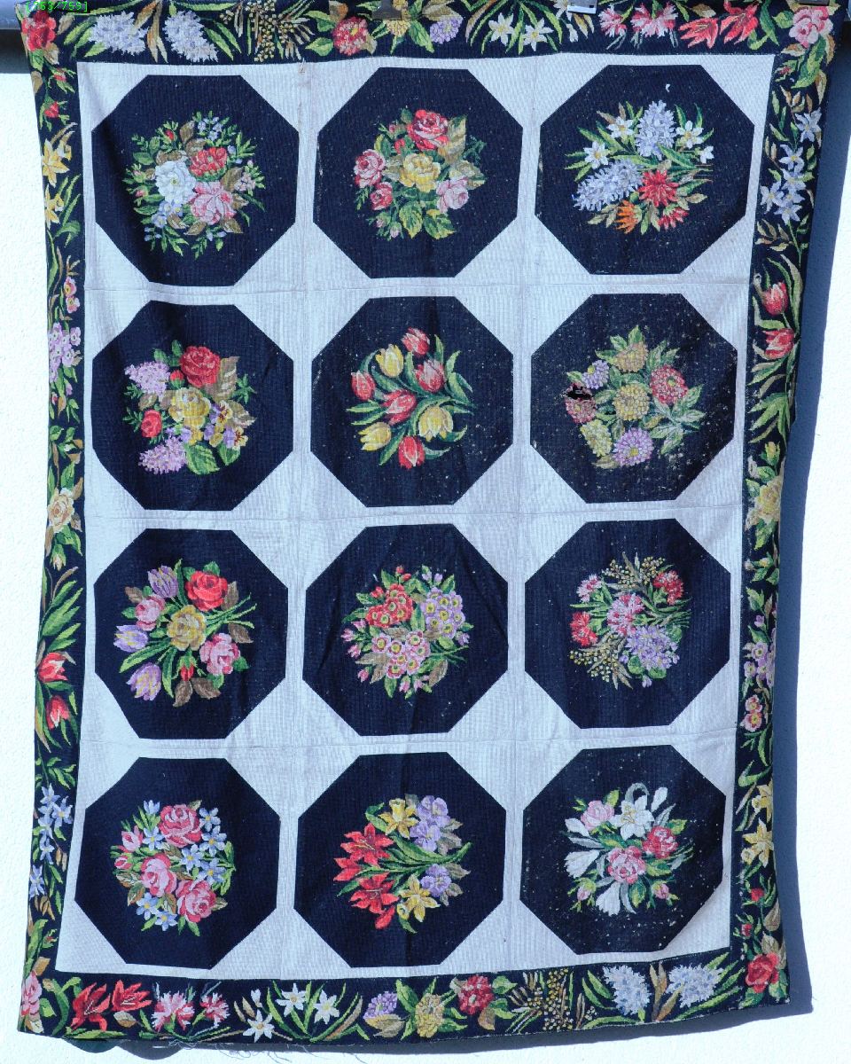 TAPISSERIE au point en laine représentant douze compositions de fleurs polychromes sur fond noir dans des octogones sur fond beige. Bordure de fleurs au naturel. XIXème. 230 x 182 cm (usures).