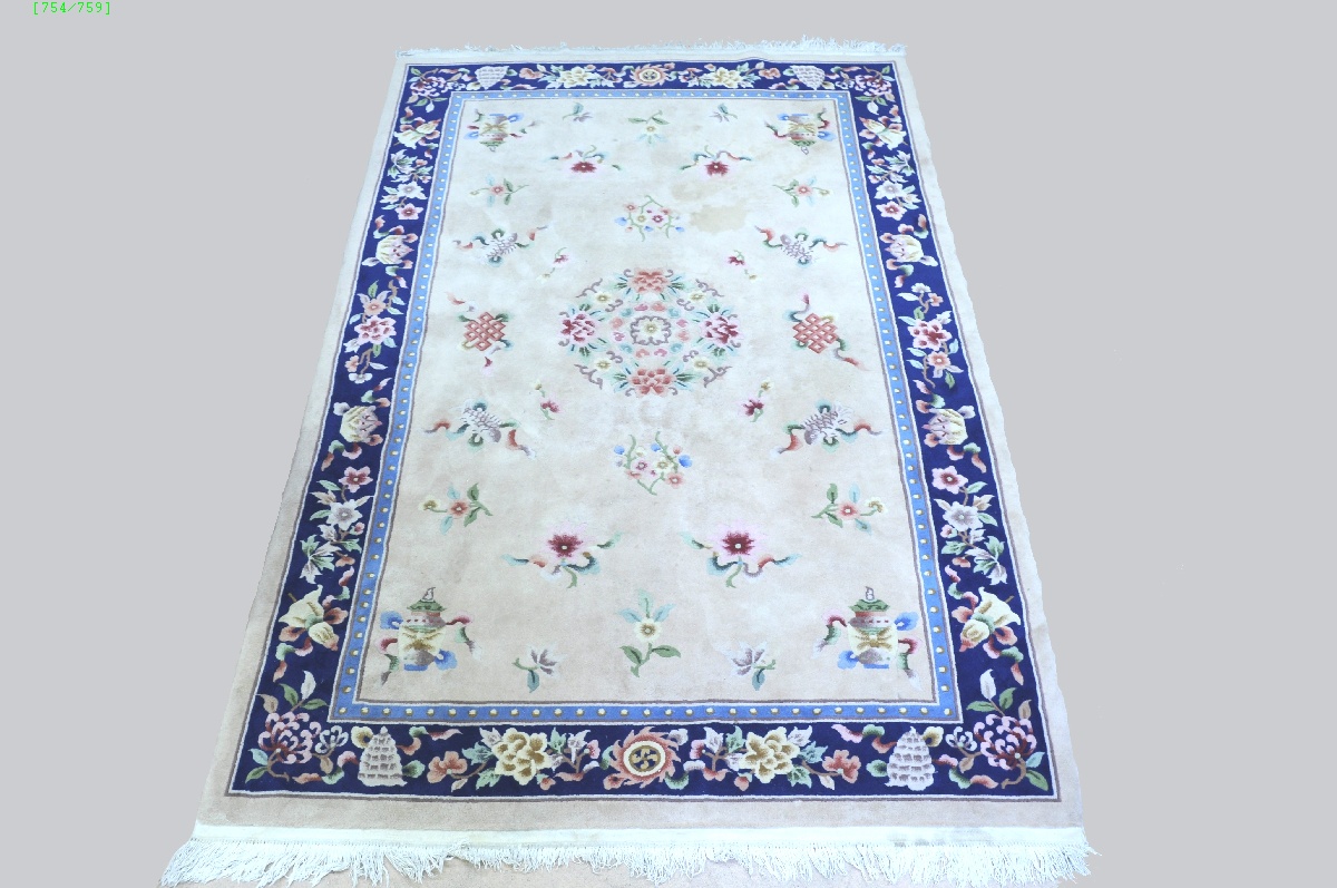 TAPIS de la CHINE, en laine à fond beige ormé de motifs fleuris et de vases. Bordure bleu soutenu. Manufacture de TienTsin, XXe siècle. 273 x 184 cm.