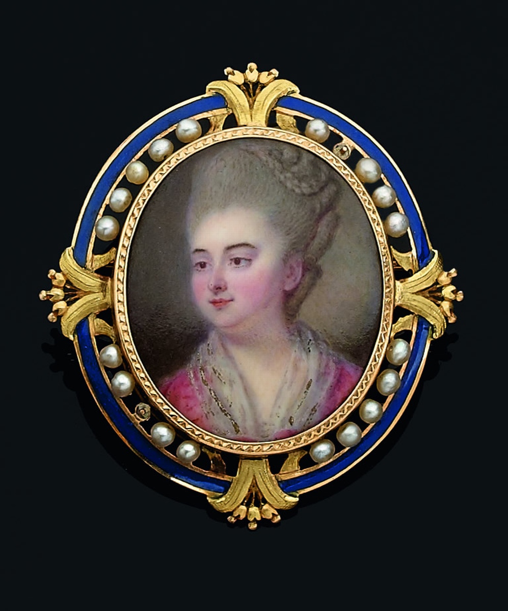 BROCHE de forme ovale en or jaune partiellement ajouré, ornée de petites perles dans un entourage de filets d'émail bleu, ornée au centre d'une miniature représentant une femme en buste émaillée en polychromie, gravée au dos "Fr. Jac.Marg...Etignard de Coulon née le 9 mai 1758 peinte le 24.7.1775 par Pasquier Peintre du Roi".