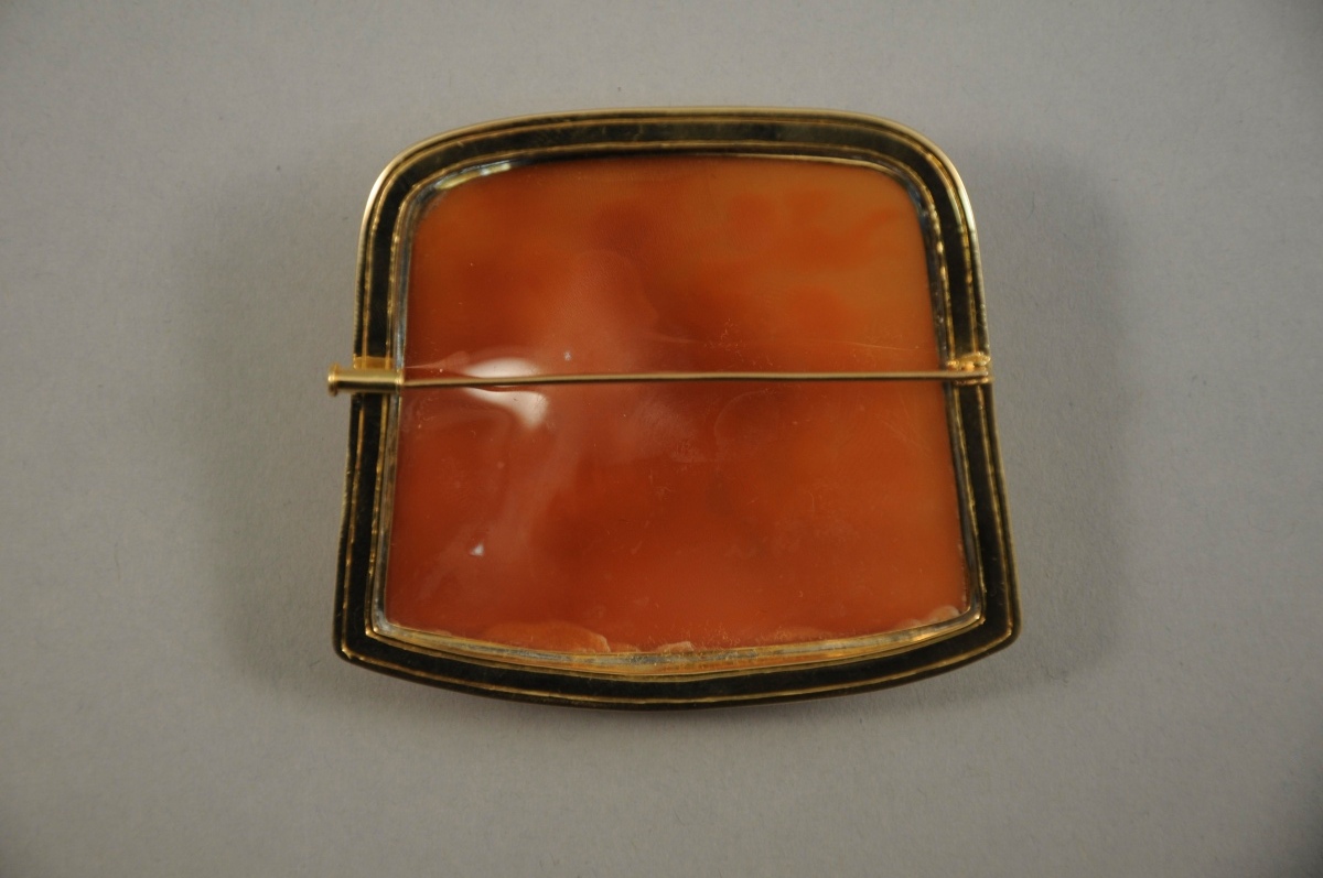 BROCHE en forme de trapèze en or jaune, ornée d'un camée coquille, représentant une femme et deux amours dans un décor paysagé.