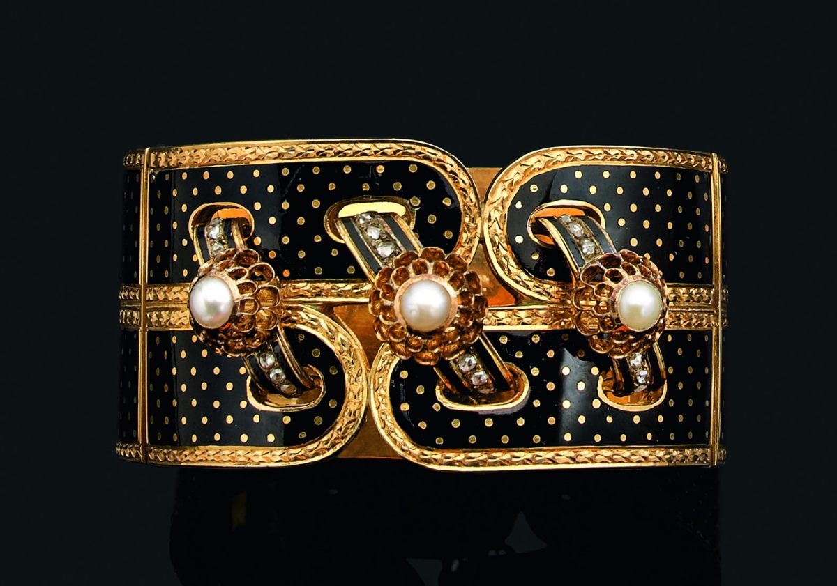 BRACELET large et articulé, en or jaune émaillé noir, le centre simulant des boucles ornées de demi-perles, entre des lignes de diamants taillés en rose et des filets d'émail noir.