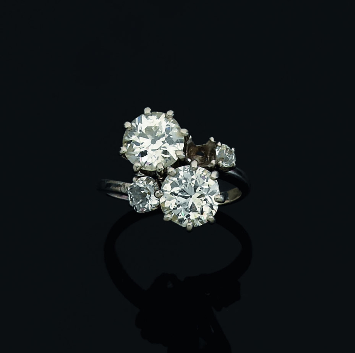 BAGUE "toi et moi" sertie de deux diamants demi-taille d'environ 2,5 carats, supposés ISI la monture en platine ornée de deux petits diamants.