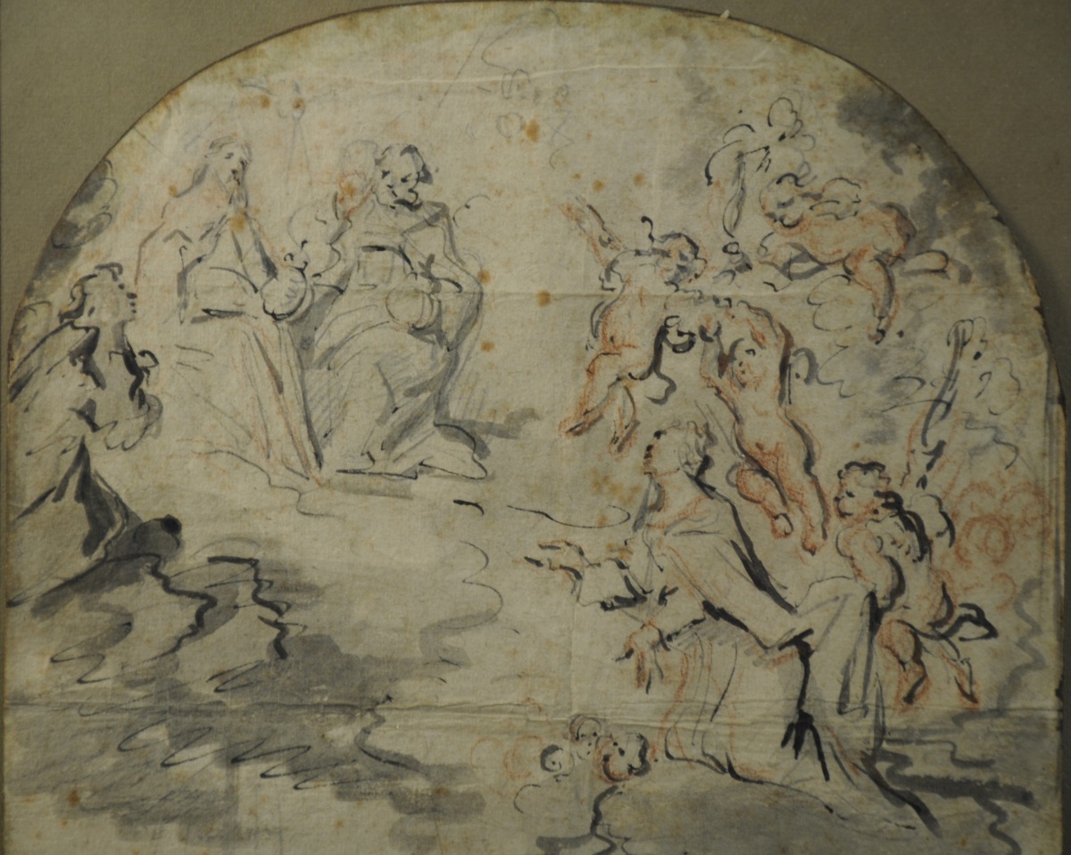 Lavis noir et gris, sanguine sur traits à la pierre noire.