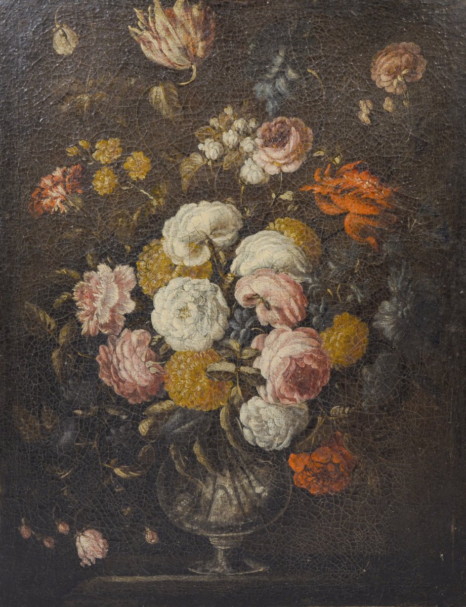 Bouquet de pivoines, illets et tulipes dans un vase de verre.