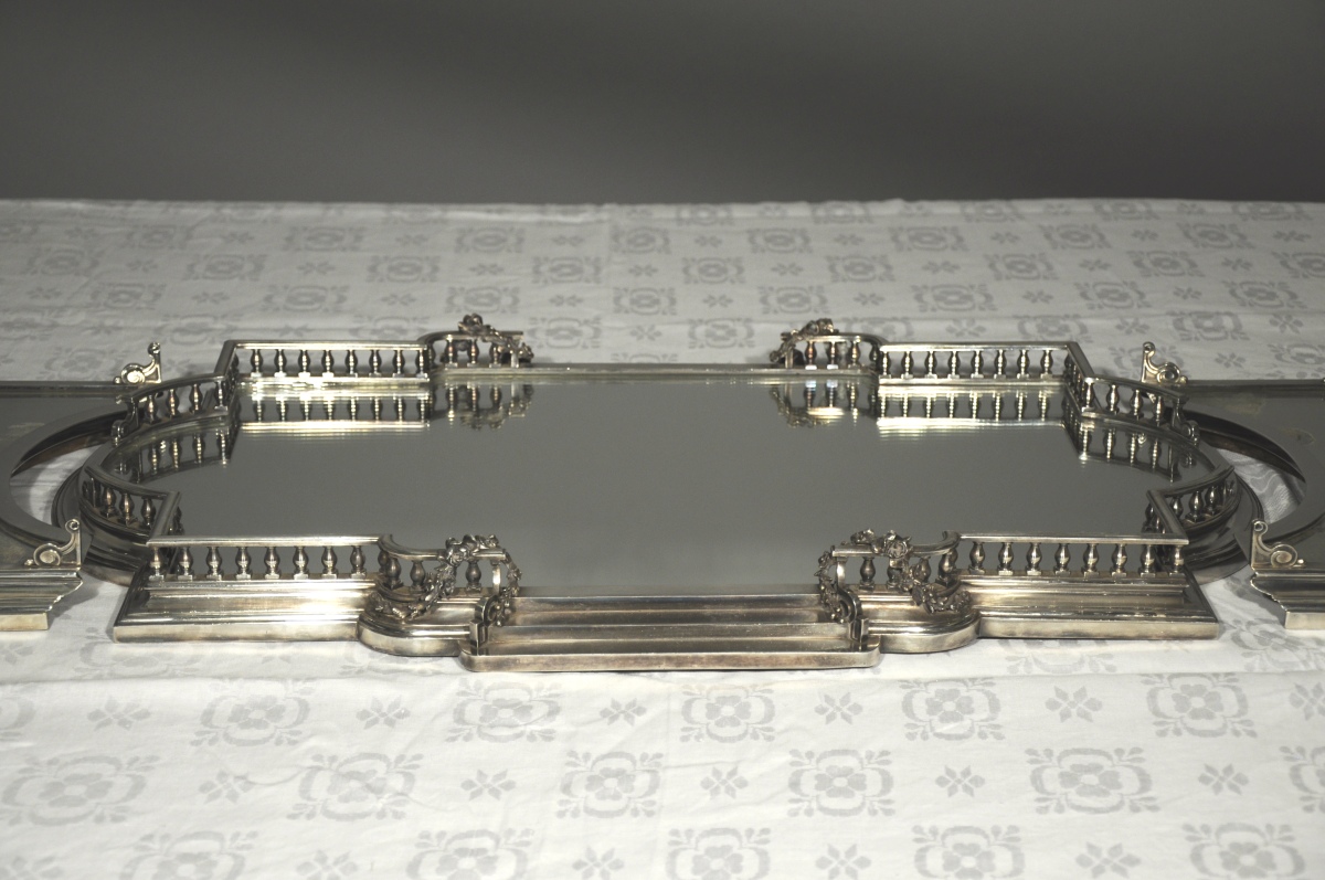 SURTOUT de TABLE en métal argenté comprenant trois éléments foncés de miroirs. L'élément central de forme rectangulaire, aux extrémités de forme arrondie. Il simule une terrasse avec balustrade, escaliers et guirlandes de fleurs.