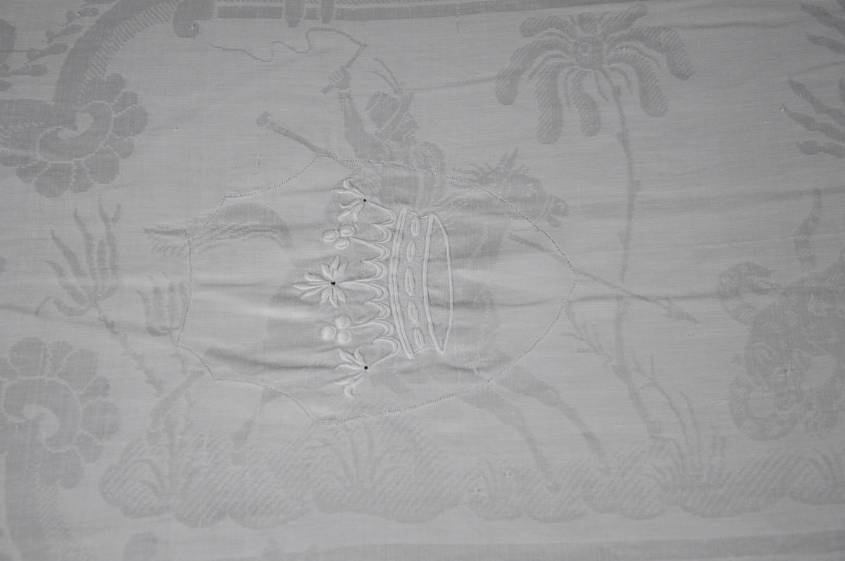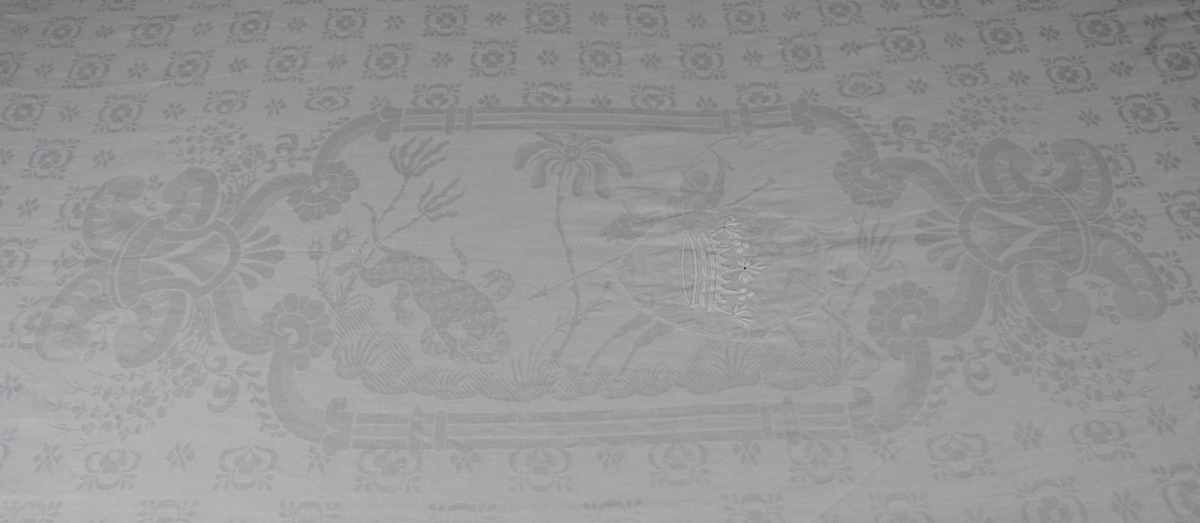 - Grande nappe de chasse rebrodée de deux couronnes de marquis. 515 x 245 cm.
