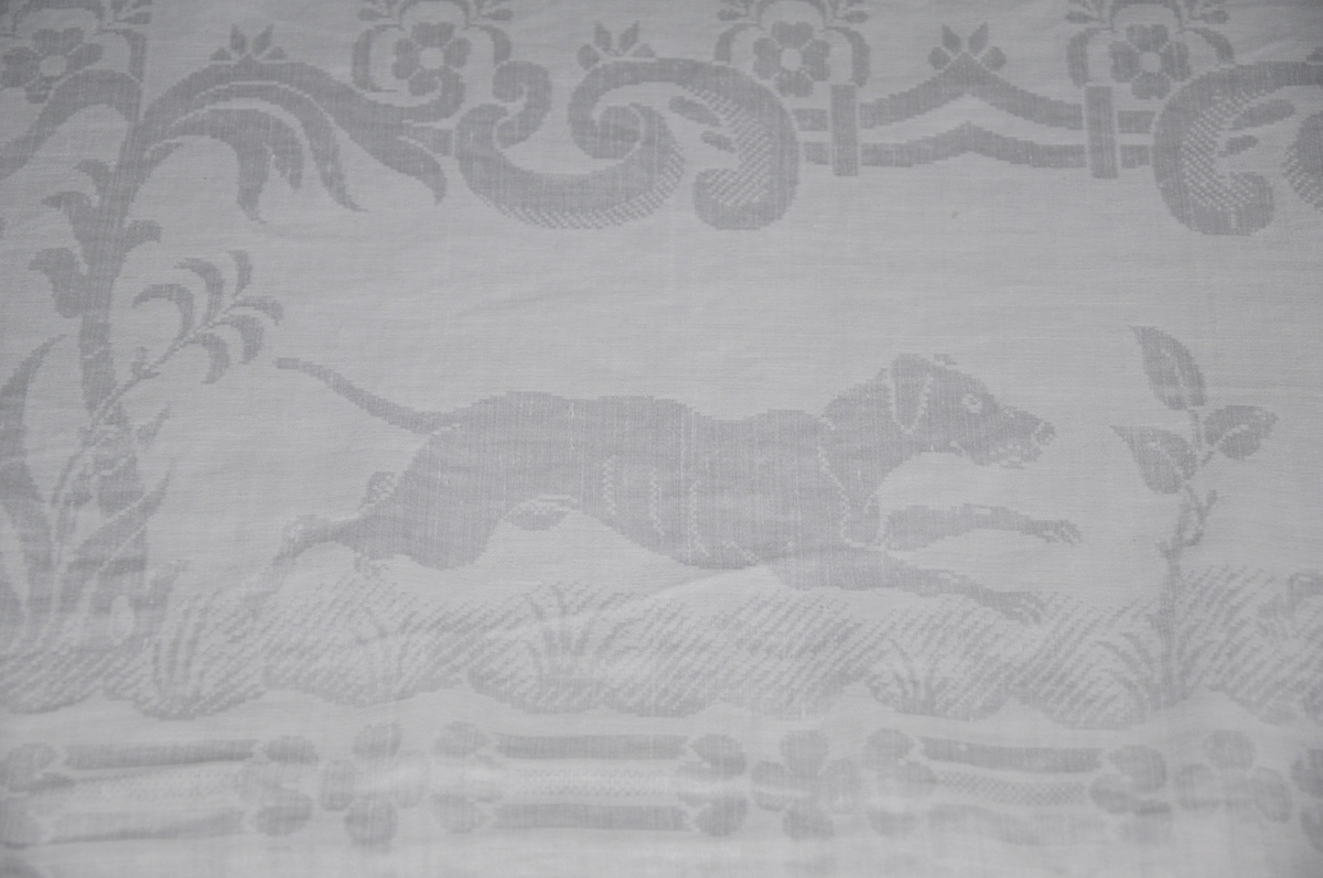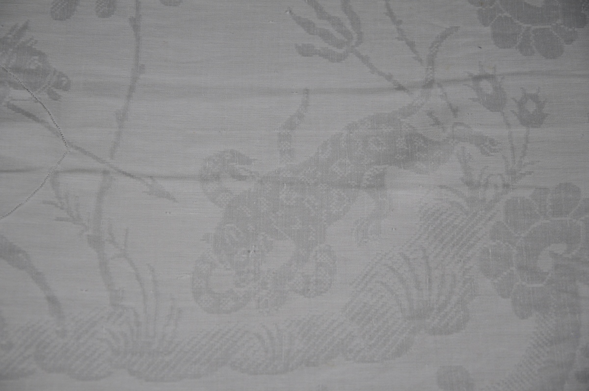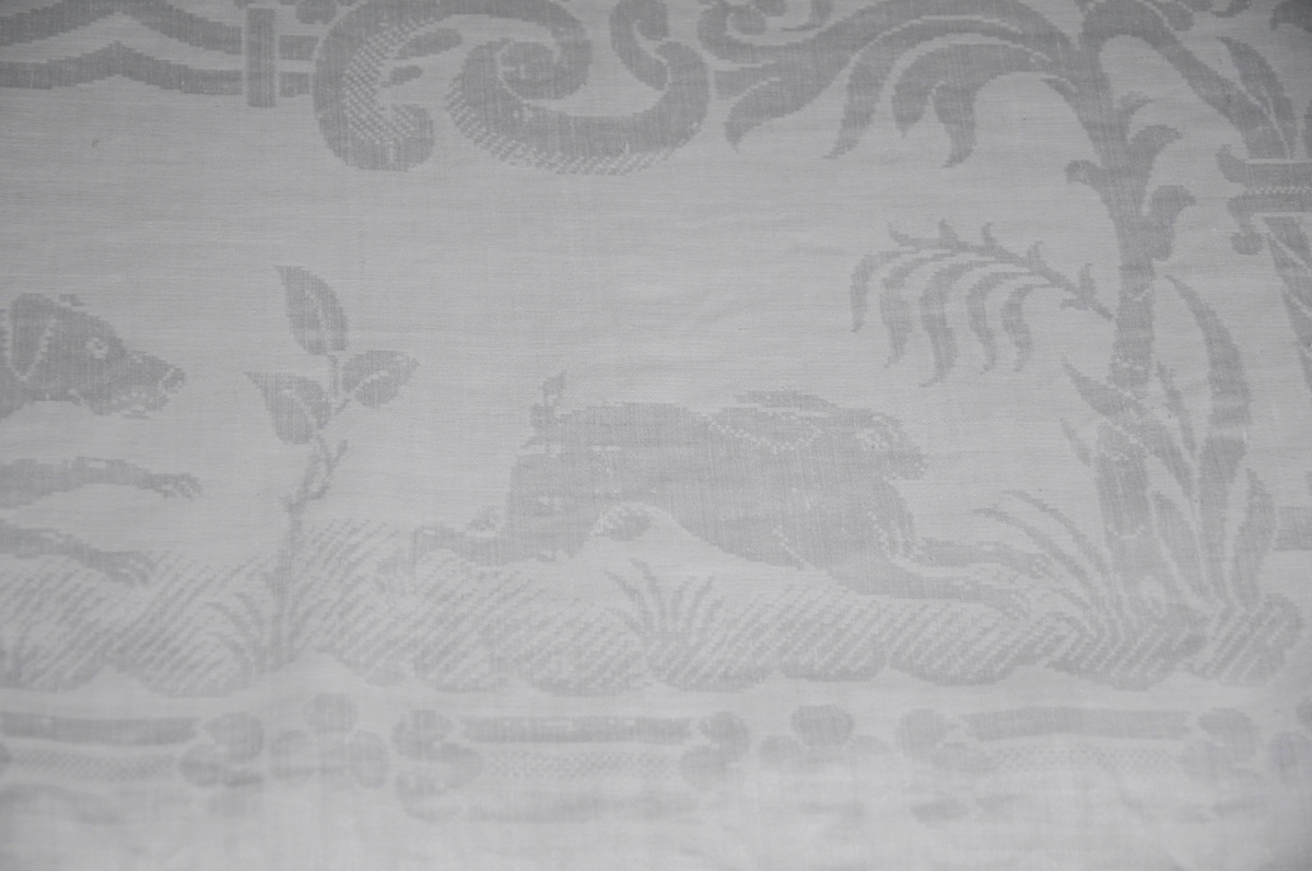 ENSEMBLE DE CHASSE en damas de lin à motifs cynégétiques de cavalier chassant un fauve dévorant un serpent - dans des cartouches entourés d’un semis fleuri, de chien chassant le lapin encadré par des portes à colonnes torses, et écureuils aux coins comprenant: