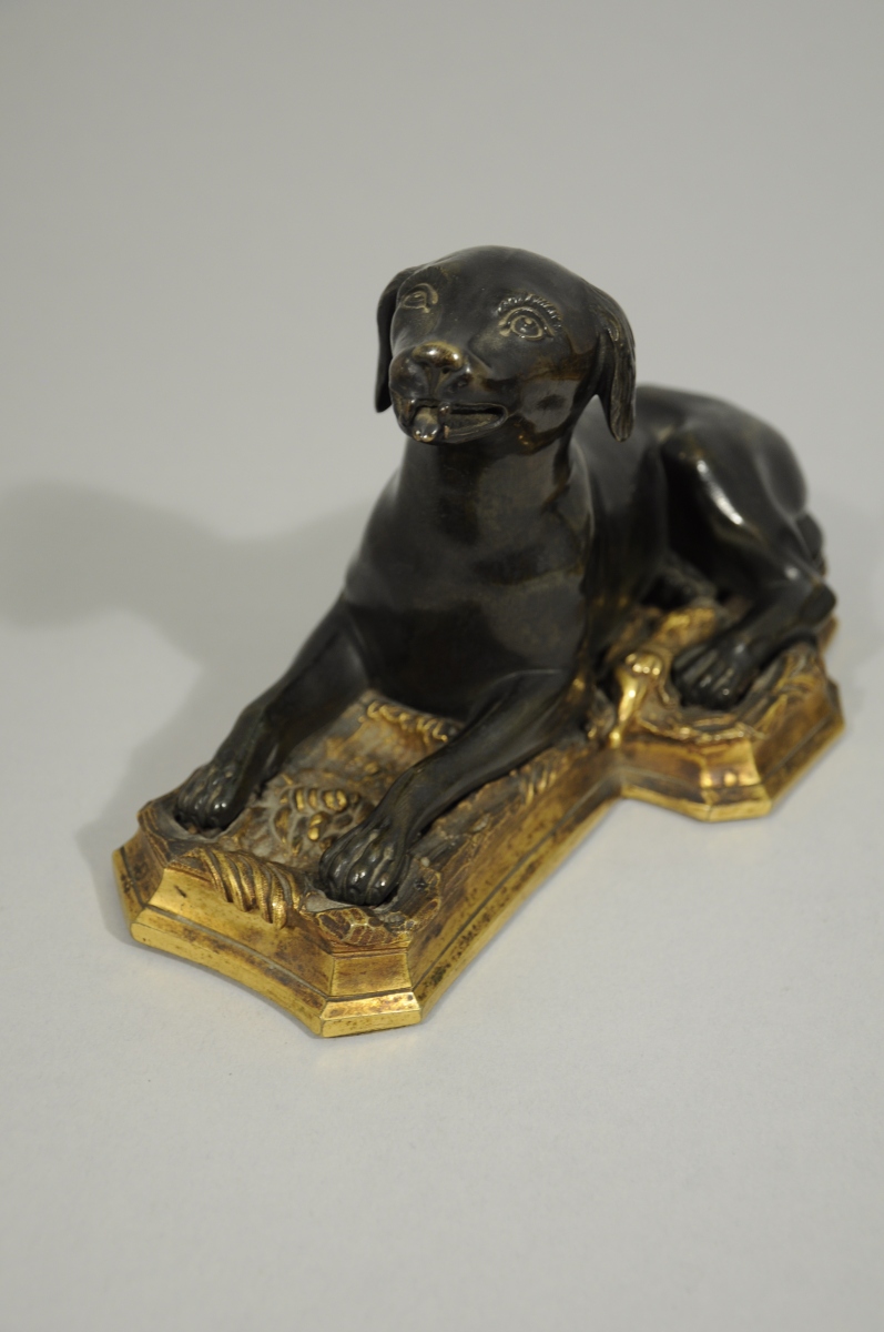 Accessoires de l'homme de lettres, ces chiens sont à poser à même les dossiers, sur le maroquin en cuir d'une table de travail: fidèles gardiens des secrets qu'ils protègent. Des objets de cette qualité sont peu nombreux. Une paire de plaques à papier en porcelaine de Vincennes est conservée au musée des Arts décoratifs de Paris. Une autre était inventoriée par Edme François Gersaint, en 1747, dans le catalogue de la succesion de Monsieur Angran Vicomte de Fonspertuis, sous le numéro 374: "Il y a de plus une Plaque à papier, formée par un Rocher de Porcelaine, monté en Bronze. Le tout est posé fur une grande Terrasse de Bronze parfaitement reparé & doré."