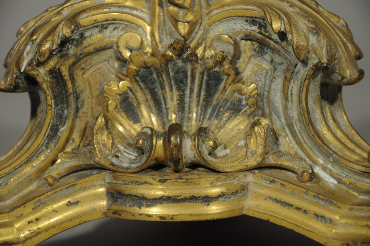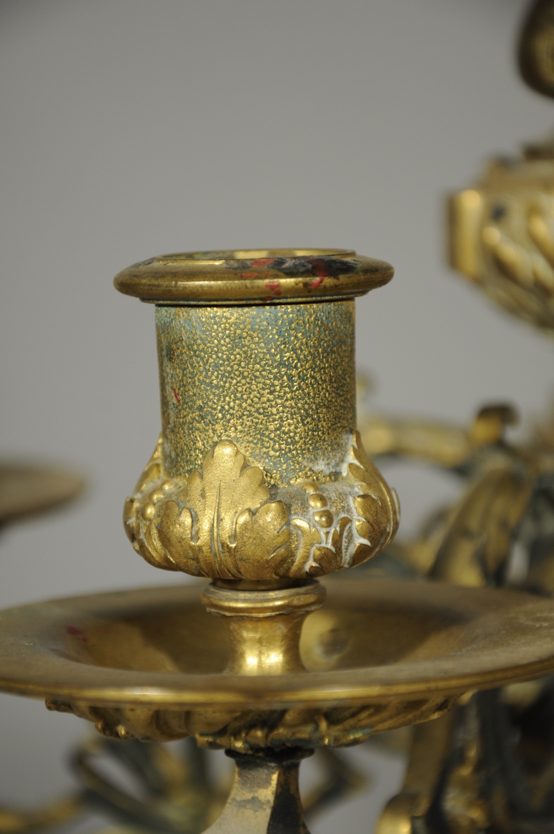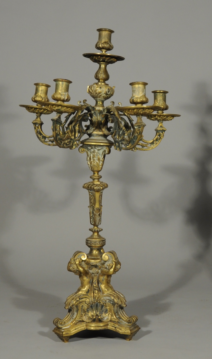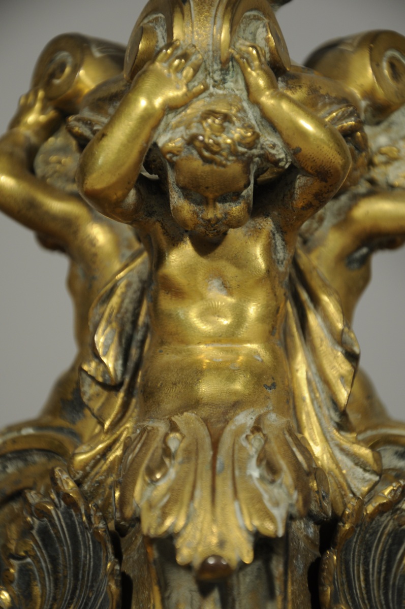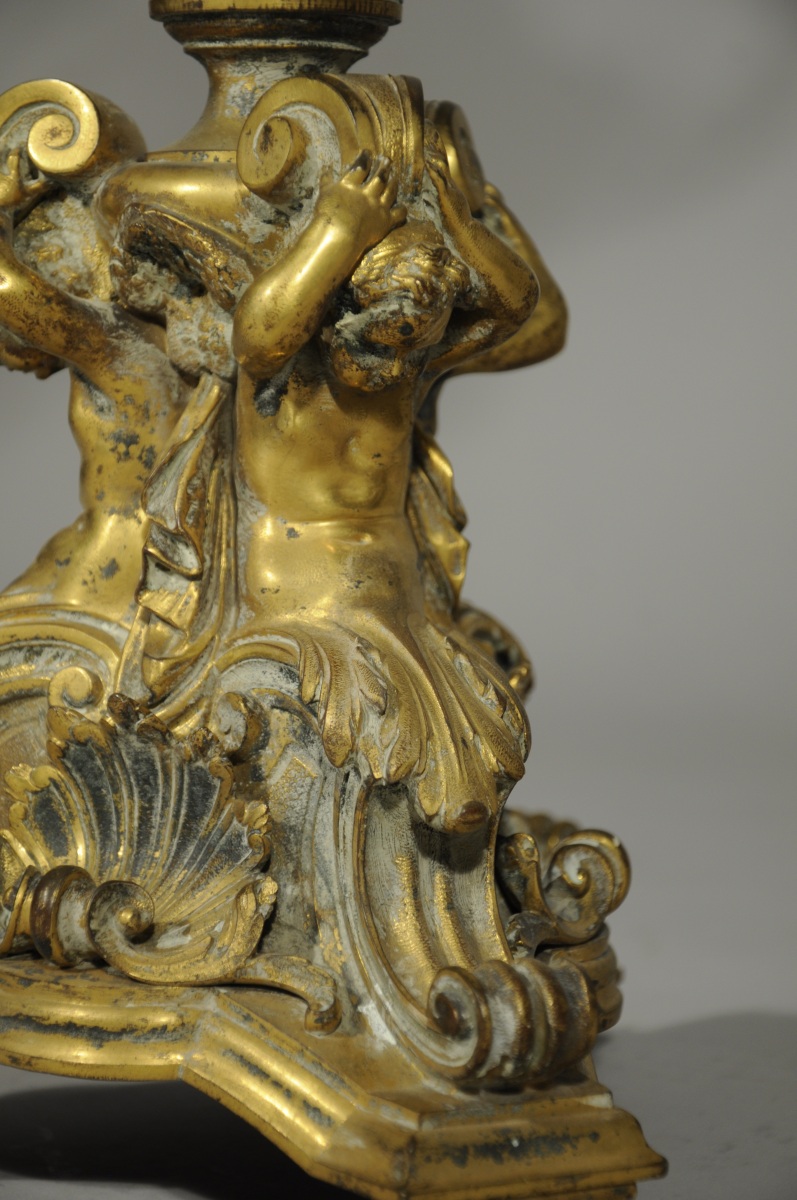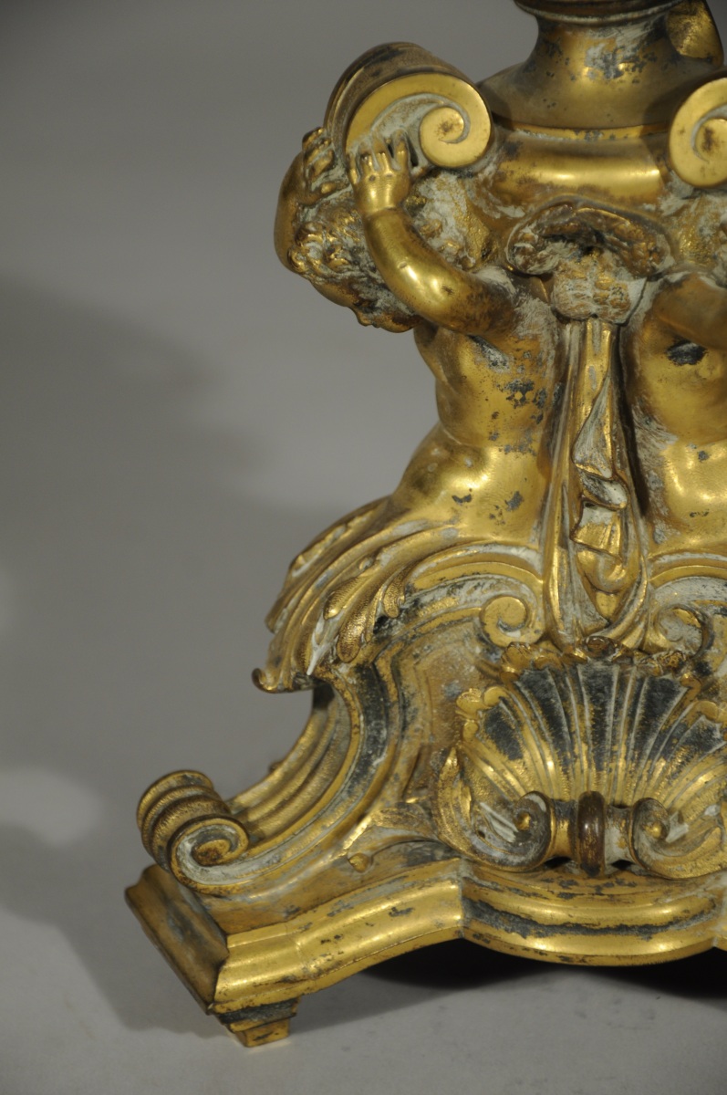PAIRE de FLAMBEAUX aux PUTTI en bronze doré. Le piètement tripode est orné de putti supportant des volutes, de feuillages et coquilles. Fûts ornés d'entrelacs, de palmes, et d'un chapiteau. Binets feuillagés. L'un des flambeaux, avec une girandole à cinq lumières, aux bras en volutes.