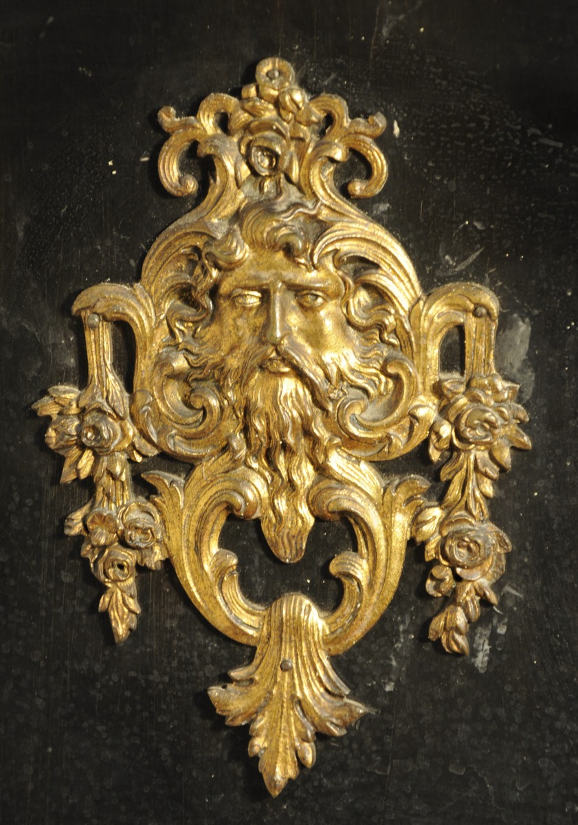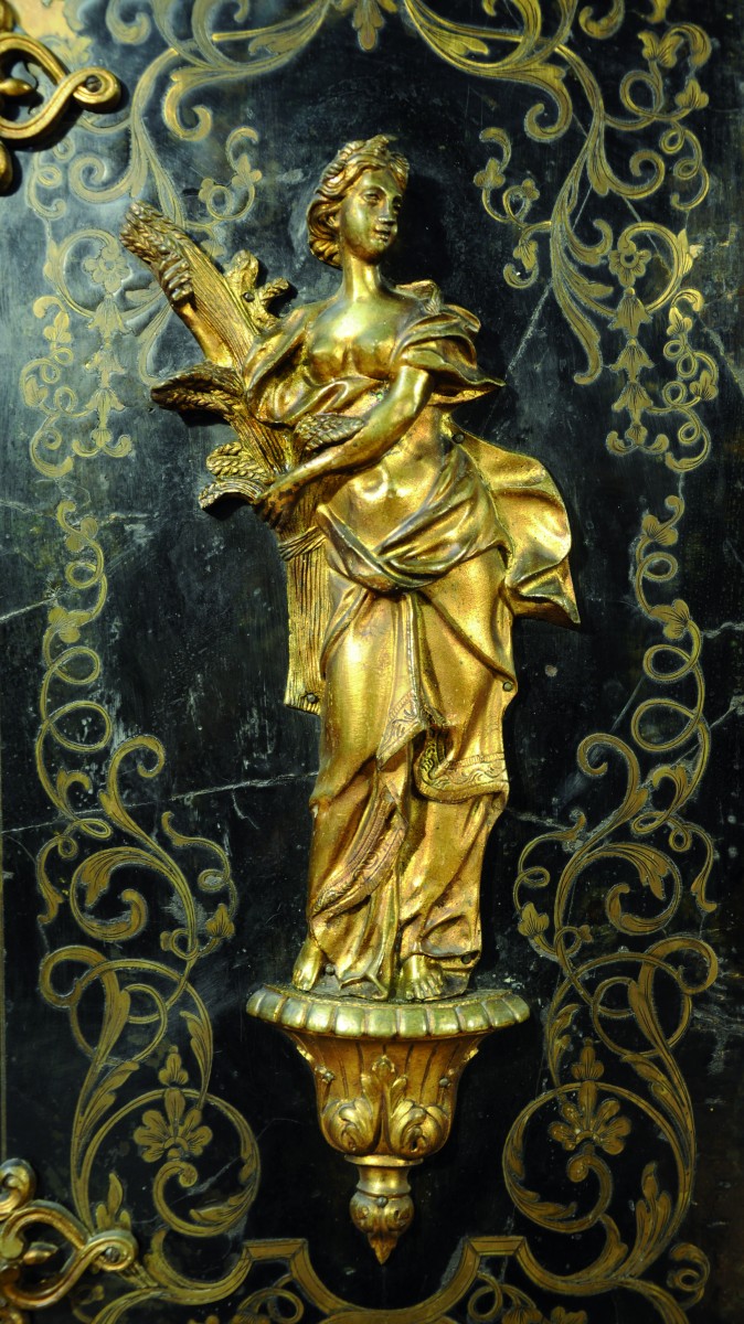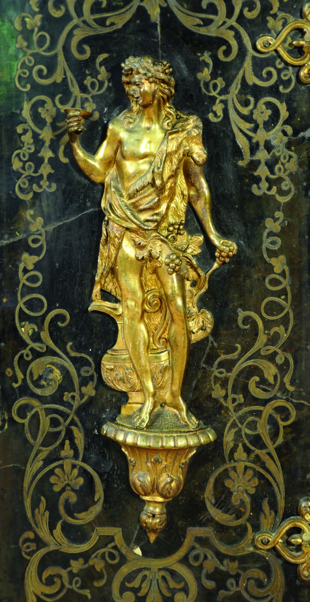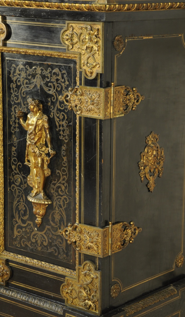 En placage d'ébène, il ouvre par deux vantaux marquetés en première partie de laiton sur fond d'écaille. Très riche ornementation de bronzes ciselés et dorés, dont allégories des Saisons: Cérès pour l'été, Bacchus pour l'automne, sur les portes et le dormant. Autres bronzes répartis en des points stratégiques sur le placage d'ébène: corniche à oves, masques de vieillard, angles à rosettes, baldaquin en dais, cul-de-lampe, charnières et pentures. Dessus de marbre noir encastré.