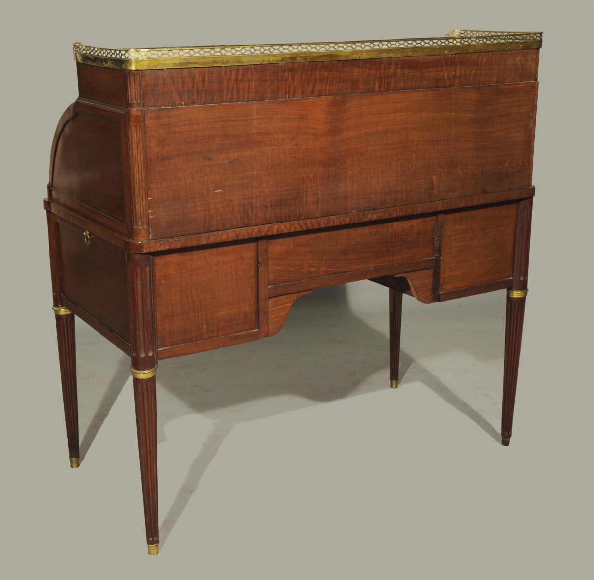 BUREAU à CYLINDRE en acajou et placage d'acajou. Il ouvre par trois tiroirs en partie supérieure. Le cylindre découvre un intérieur garni de trois tiroirs et d'un grand casier. Quatre tiroirs en partie inférieure, dont l'un comportant un casier fermant à clé. Montants cannelés, avec rudentures au niveau du cylindre. Pieds fuselés et cannelés.