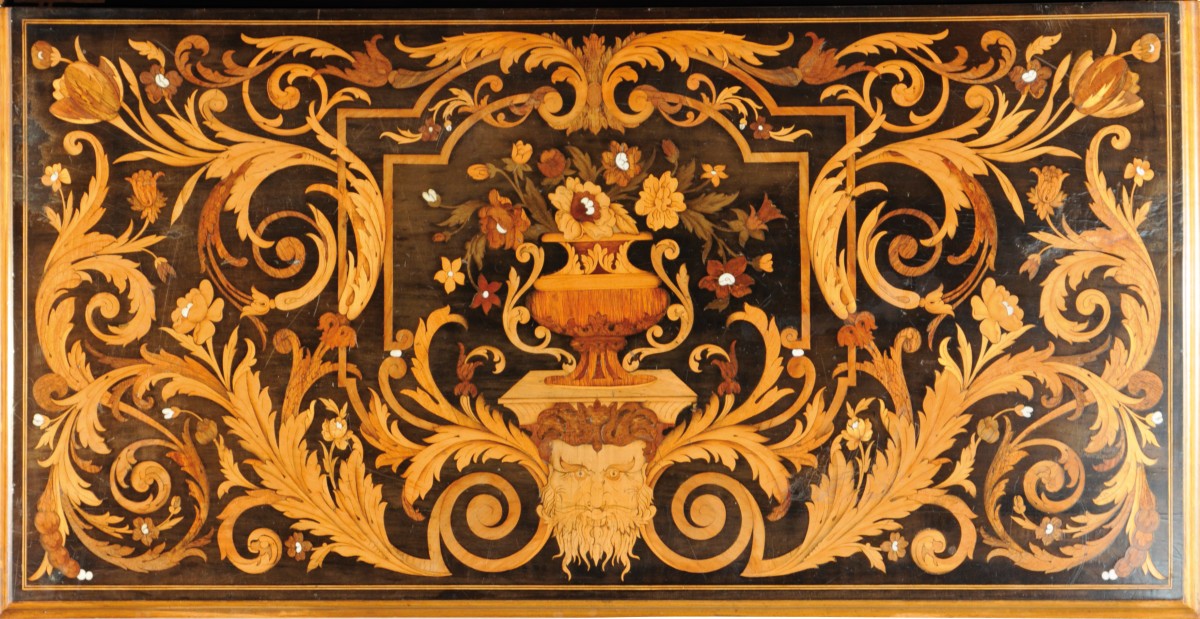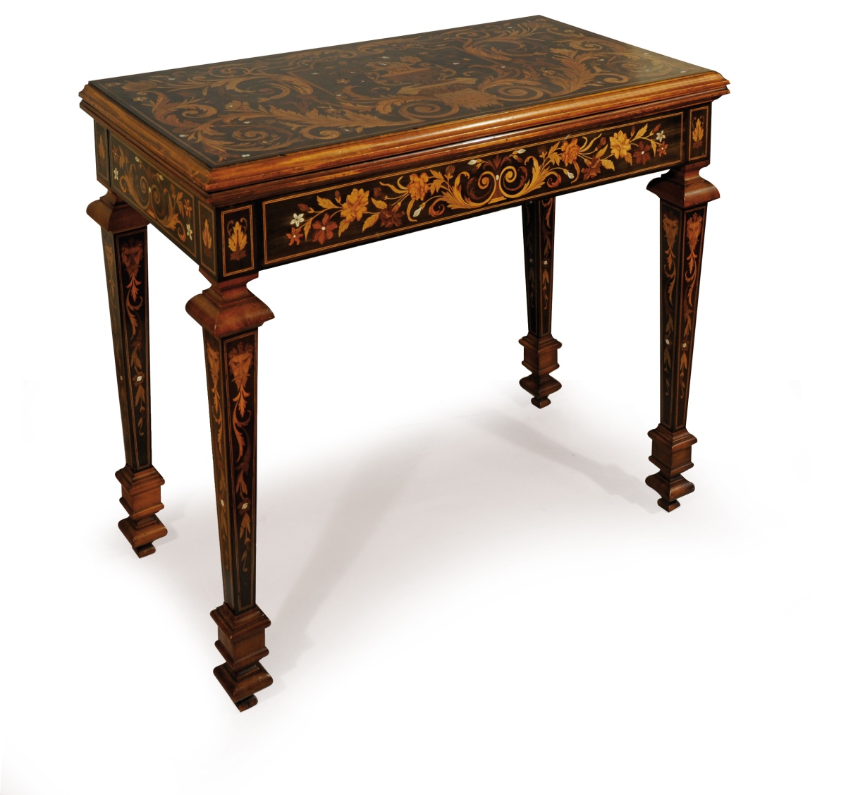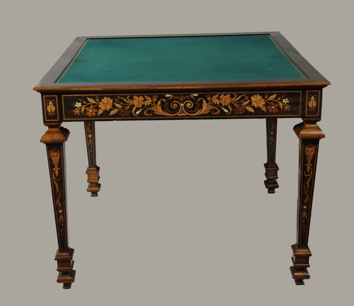 TABLE à JEU à plateau ouvrant, reposant sur quatre pieds gaines à bases et chapiteaux en noyer mouluré. Riche décor marqueté d'essences exotiques et d'ivoire sur fond d'ébène, figurant un vase fleuri sur un entablement, au-dessus d'un masque d'homme barbu, et entouré de rinceaux, feuillages et fleurs. Pieds ornés sur chacune de leurs faces de visages barbus et de rinceaux. Plateau foncé intérieurement de tissu vert.