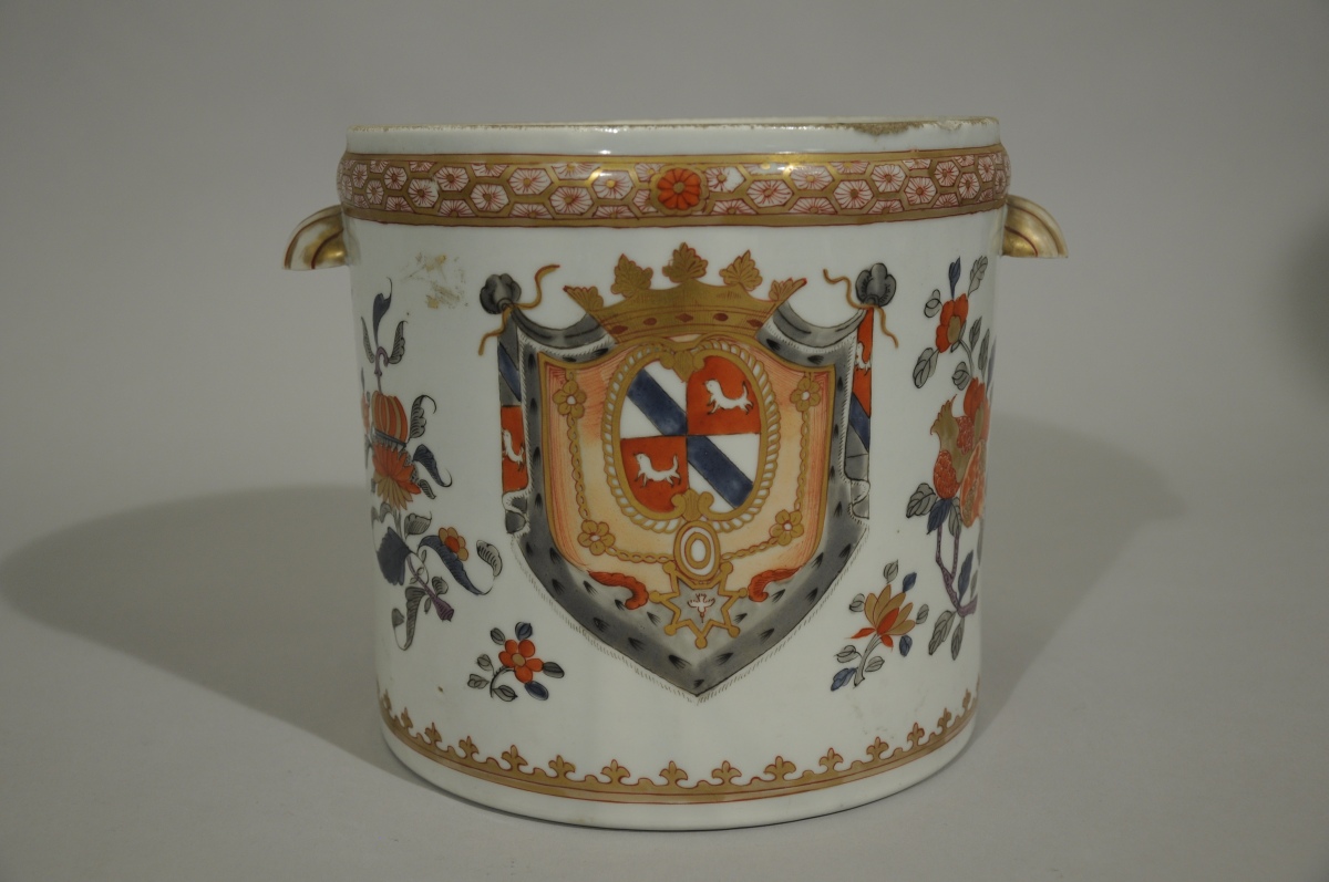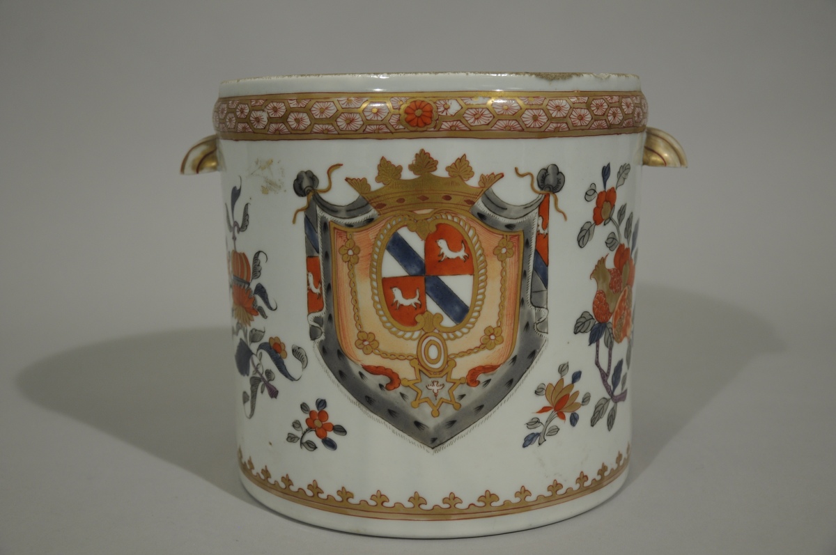 Paire de RAFRAÎCHISSOIRS en porcelaine décorée en émaux polychromes des armoiries de France, entourés de pivoines et grenades.
