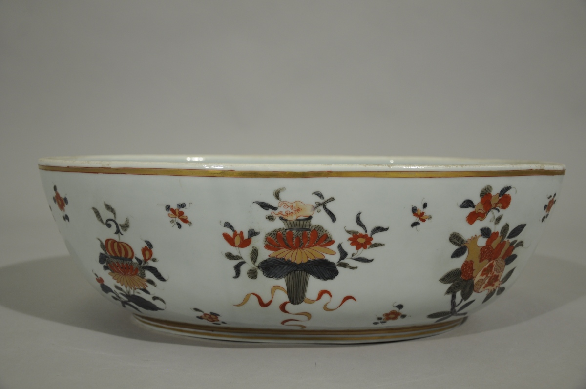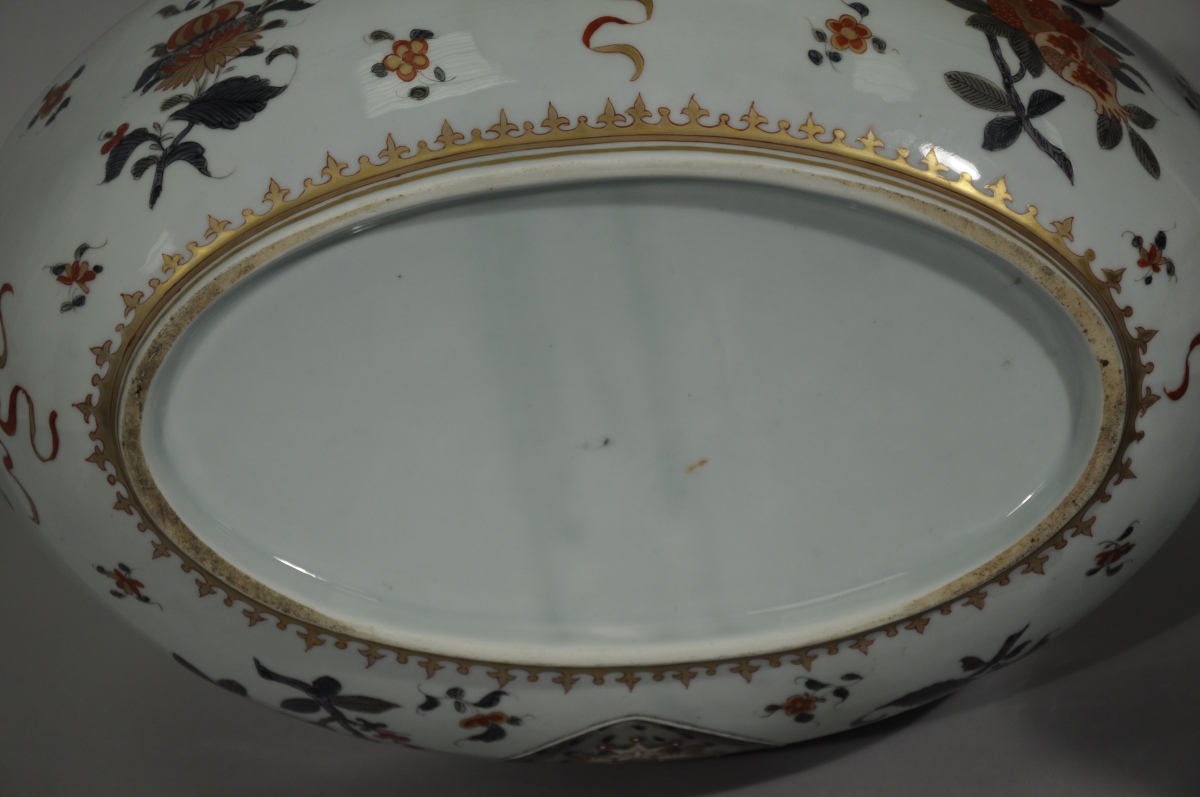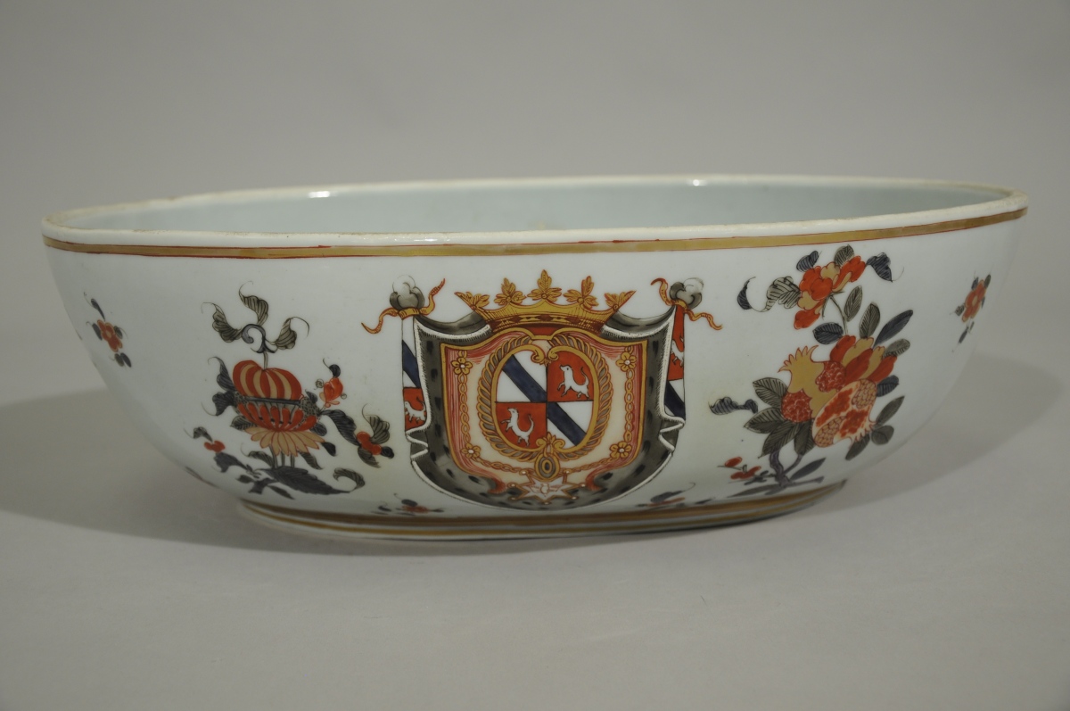 Grande VASQUE de forme ovale en porcelaine décorée en émaux polychromes et or d'armoiries et bouquets fleuris de pivoines et grenades, le bord décoré de frise de fers de lance.
