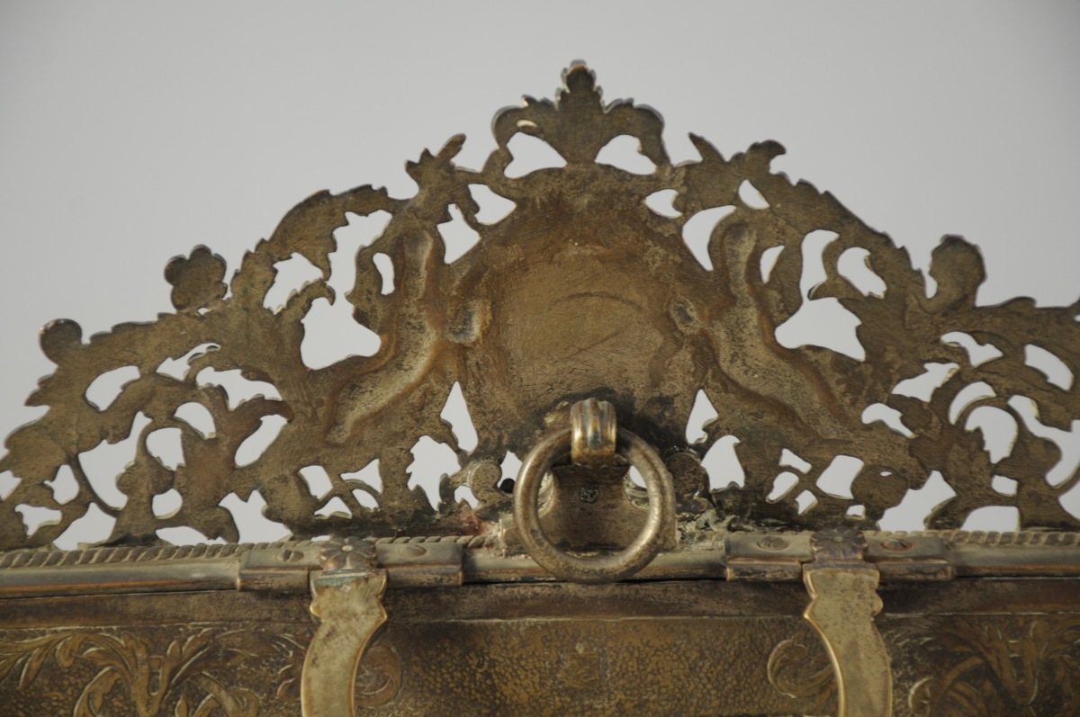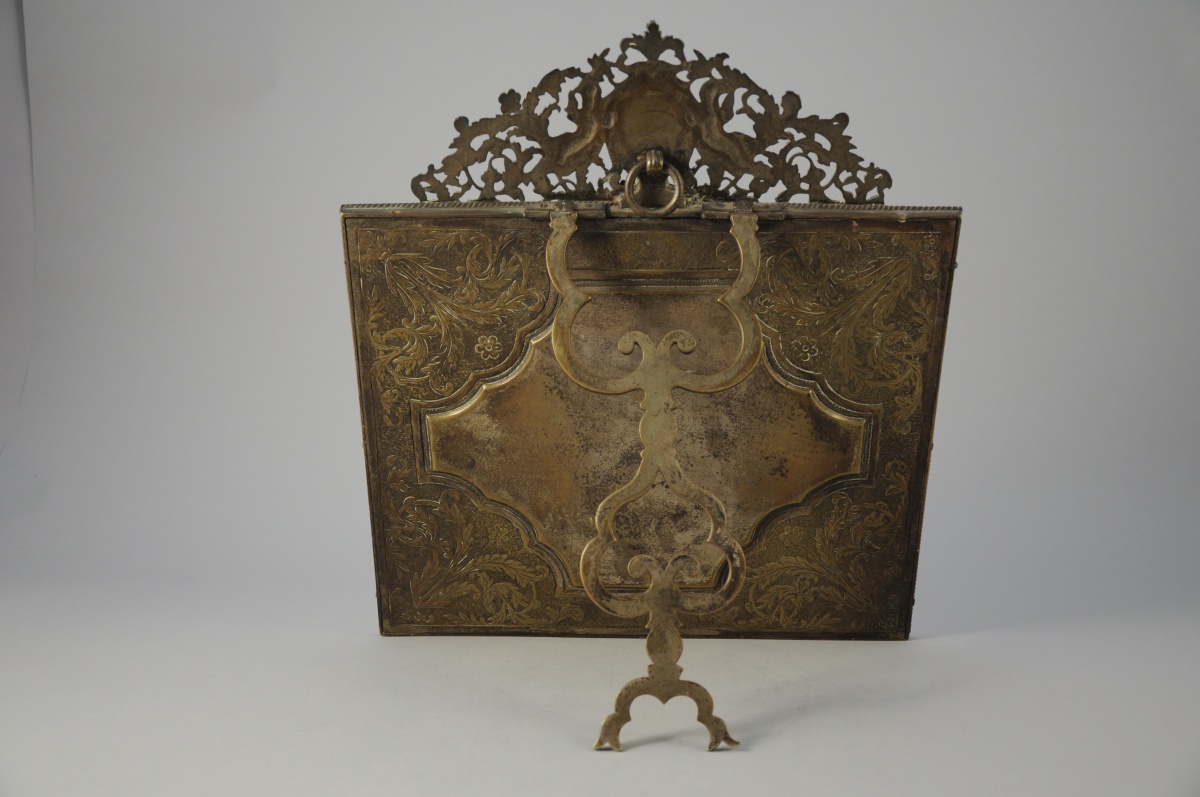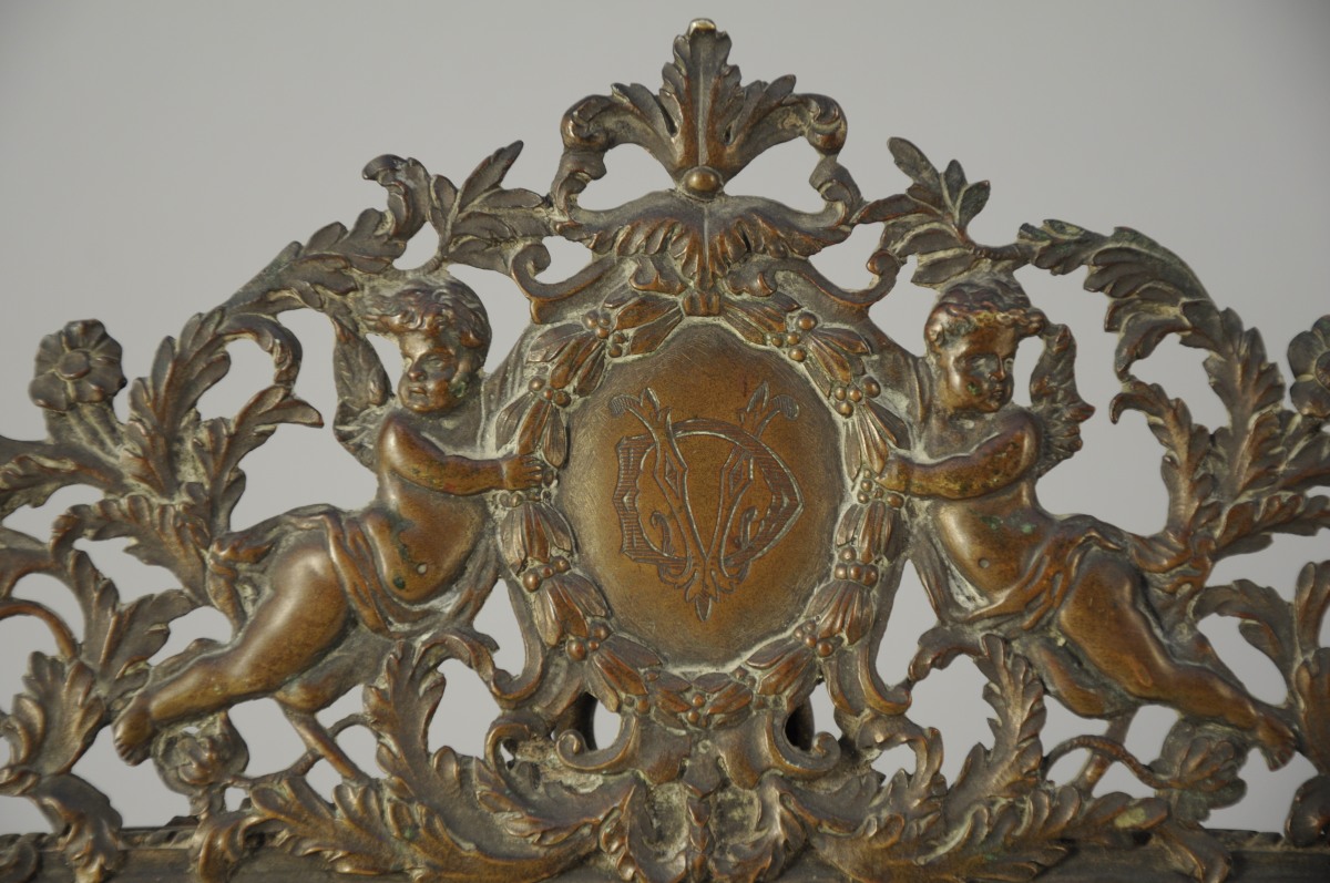 CADRE rectangulaire en bronze ciselé et patiné. Des visages de femmes surmontés de corbeilles de fleurs se détachent dans les écoinçons. Fronton ajouré, portant le monogramme "DV" dans un cartouche soutenu par deux angelots, dans des rinceaux fleuris. Revers ciselé de palmes et de fleurs. Anneau de suspension et pied ajouré permettant de poser le cadre.