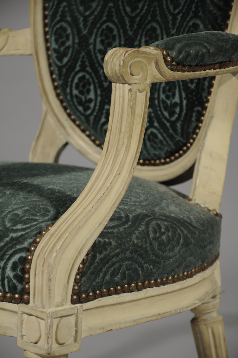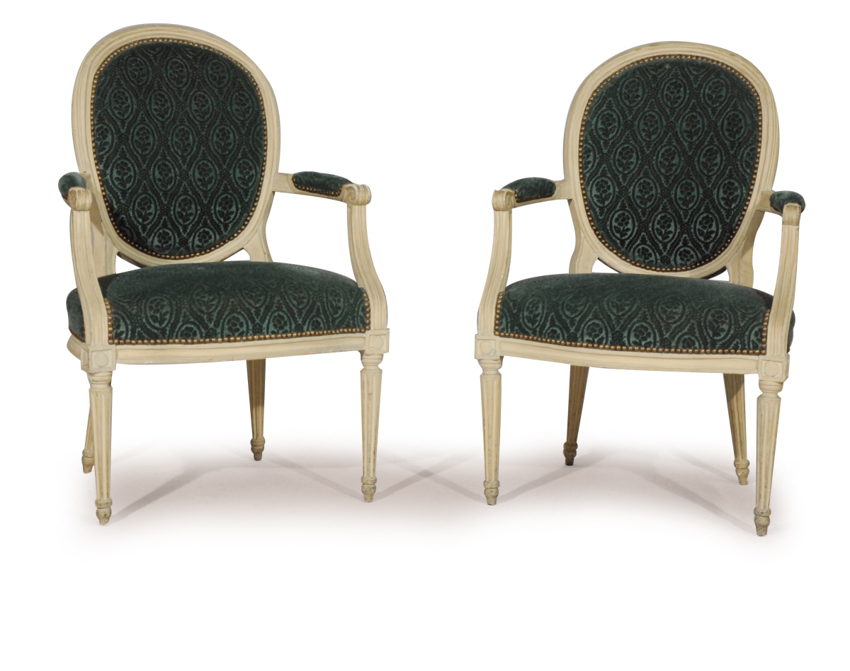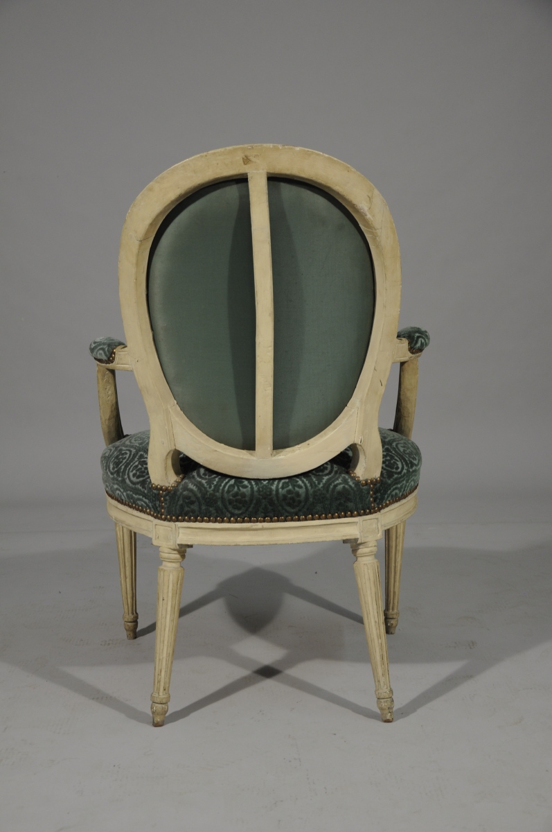 PAIRE de FAUTEUILS CABRIOLETS en bois mouluré et laqué blanc. Dossier médaillon. Accotoirs à consoles galbées. Pieds fuselés cannelés.