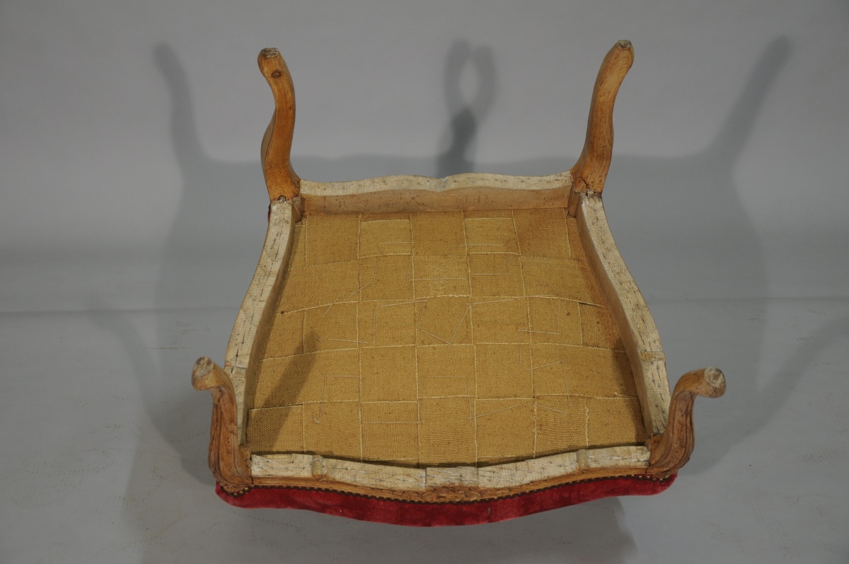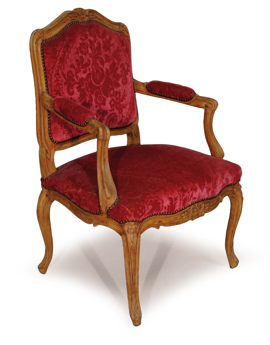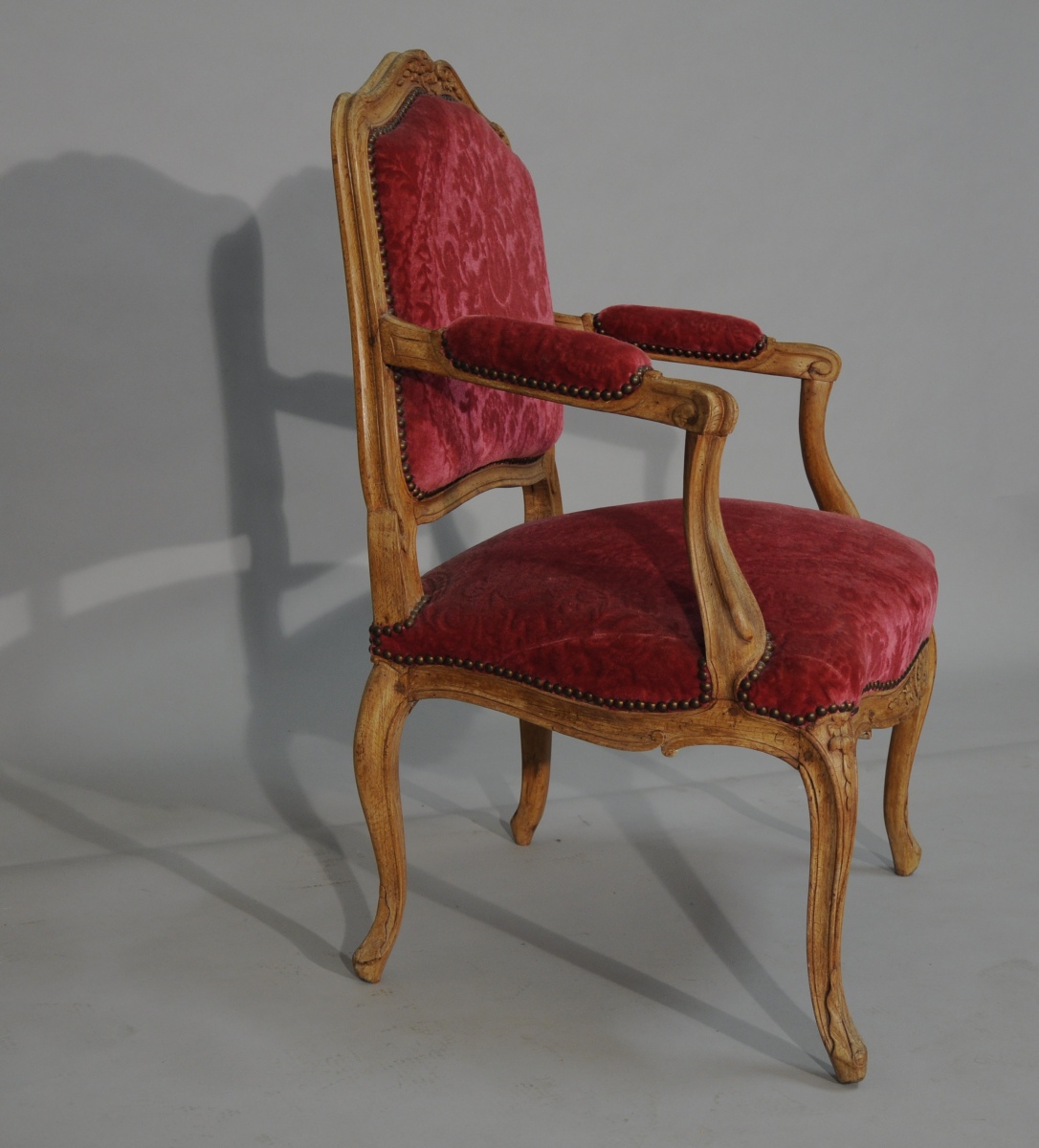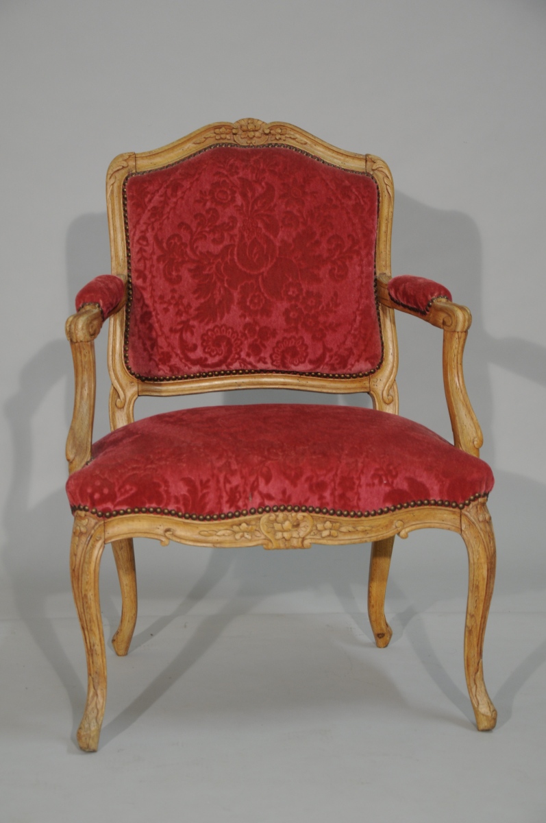 SUITE de quatre FAUTEUILS à la REINE en hêtre mouluré et sculpté. Dossiers à traverse supérieure en chapeau de gendarme. Accotoirs à consoles légèrement cambrées. Ceinture chantournée et pieds cambrés. Décor sculpté de fleurettes, agrafes et palmes.