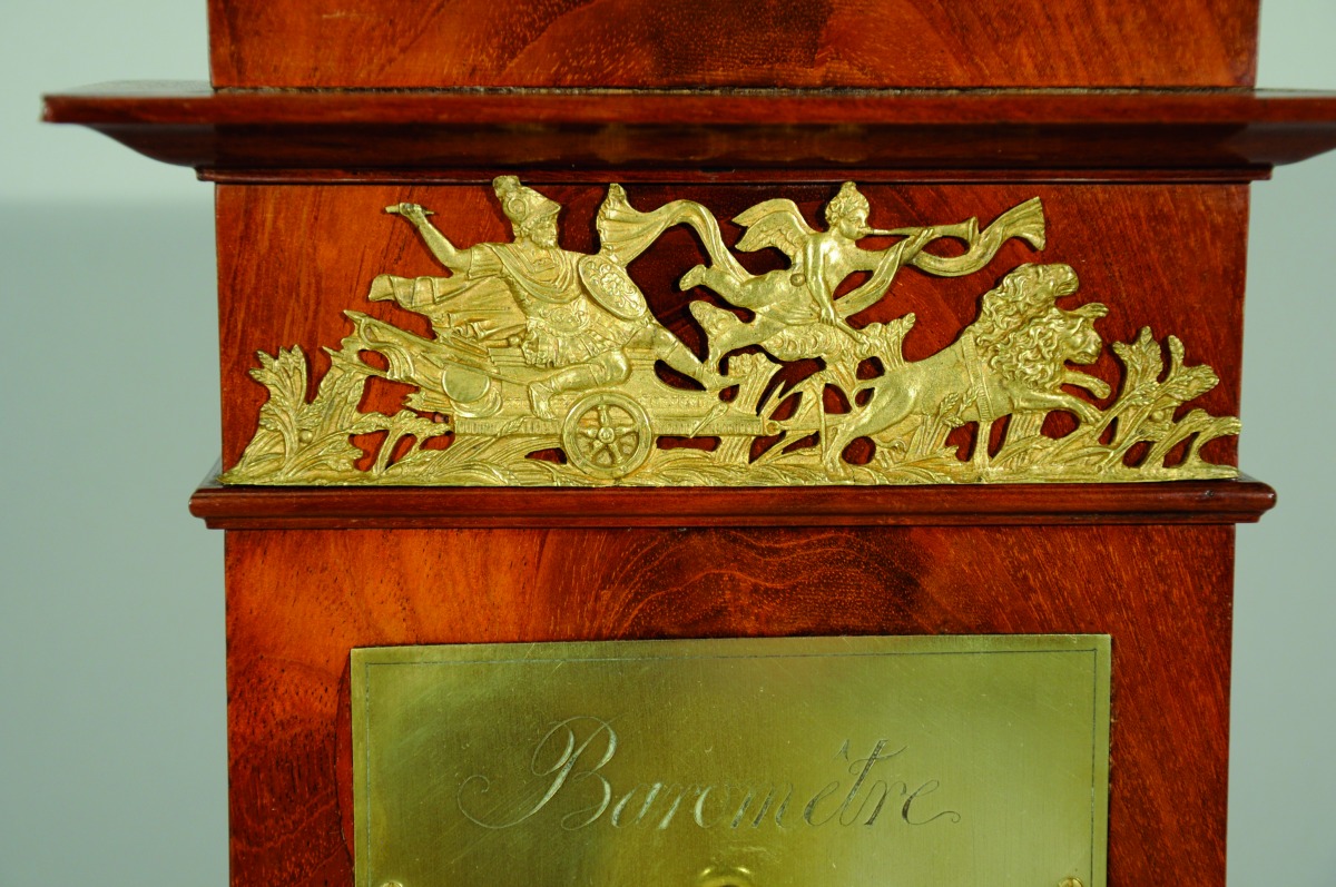 BAROMÈTRE-THERMOMÈTRE de salon en acajou et placage d'acajou. Il indique les variations climatiques sur une plaque de laiton gravé. Thermomètres selon Réaumur, l'un en degrés Fahrenheit ; l'autre en degrés Celsius. Ornementation de bronzes ciselés et dorés, figurant en partie supérieure le char de Mars, attelé à des lions et suivi d'une Victoire ailée, et, en partie inférieure, un trophée d'armes. Réservoir du baromètre avec protection de bronze ornée d'une rosace, de fleurs et de grappes. Le baromètre indique les dates de 1768 et de 1821.