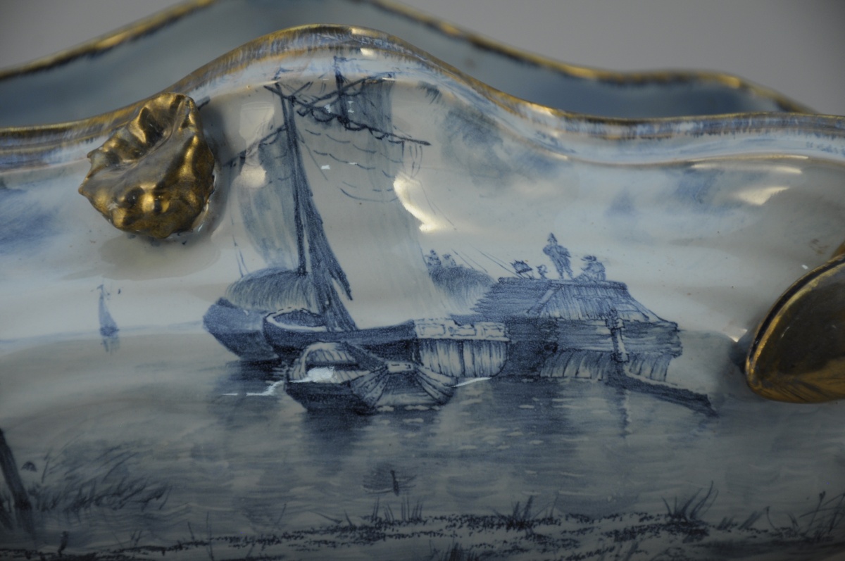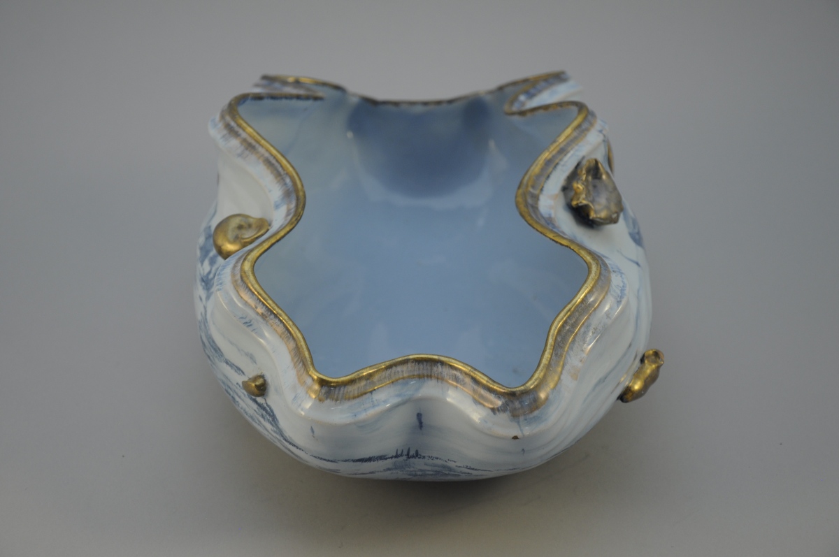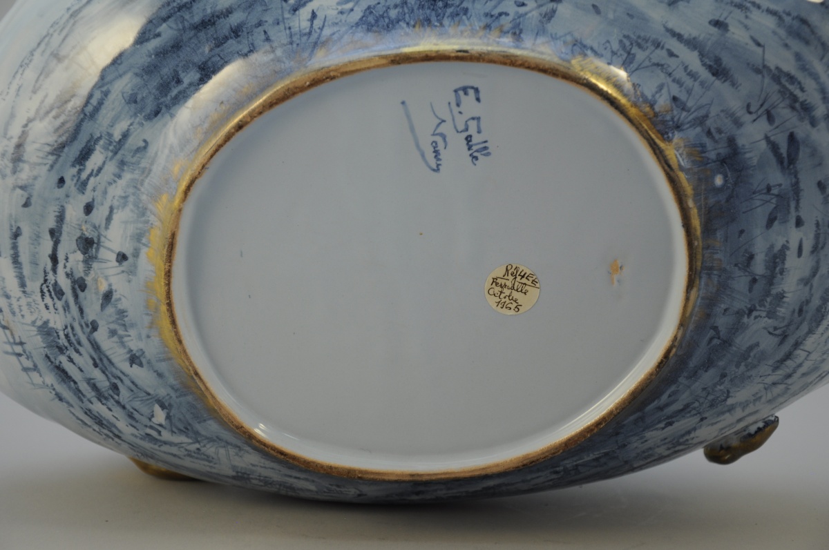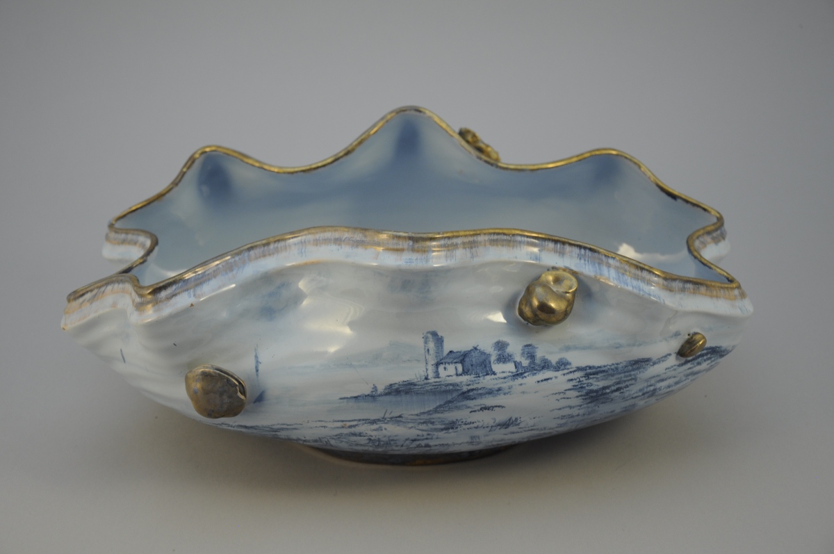 Émile GALLÉ (Nancy, 1846 - Nancy, 1904). Large COUPE en forme de conque en faïence stannifère à fond bleuté. Décor en camaïeu bleu de bateaux et de paysages animés en bord de mer. Six coquillages dorés sont accrochés au bord de la conque. Signée au revers "E. Gallé Nancy".