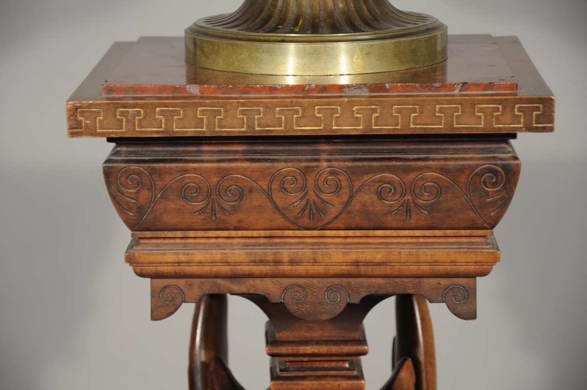 CRATÈRE en CALICE en bronze à patine brune, reposant sur une console en noyer sculpté.