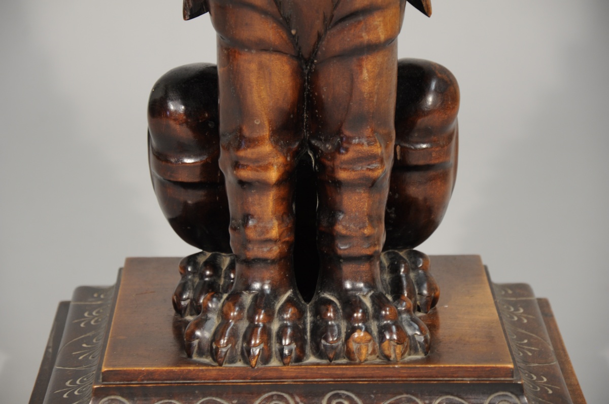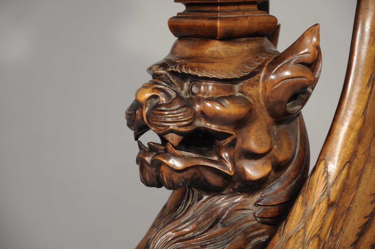 La console figure une chimère ailée, assise. Base et corniche quadrangulaires, ornées de palmes et volutes gravées. Dessus de marbre griotte.