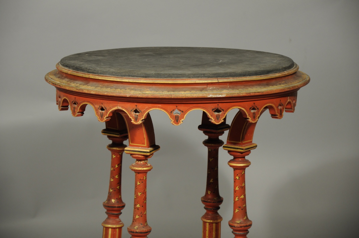La table, à plateau circulaire gainé de cuir, repose sur quatre pieds réunis par une entretoise surmontée d'un croissant de lune.