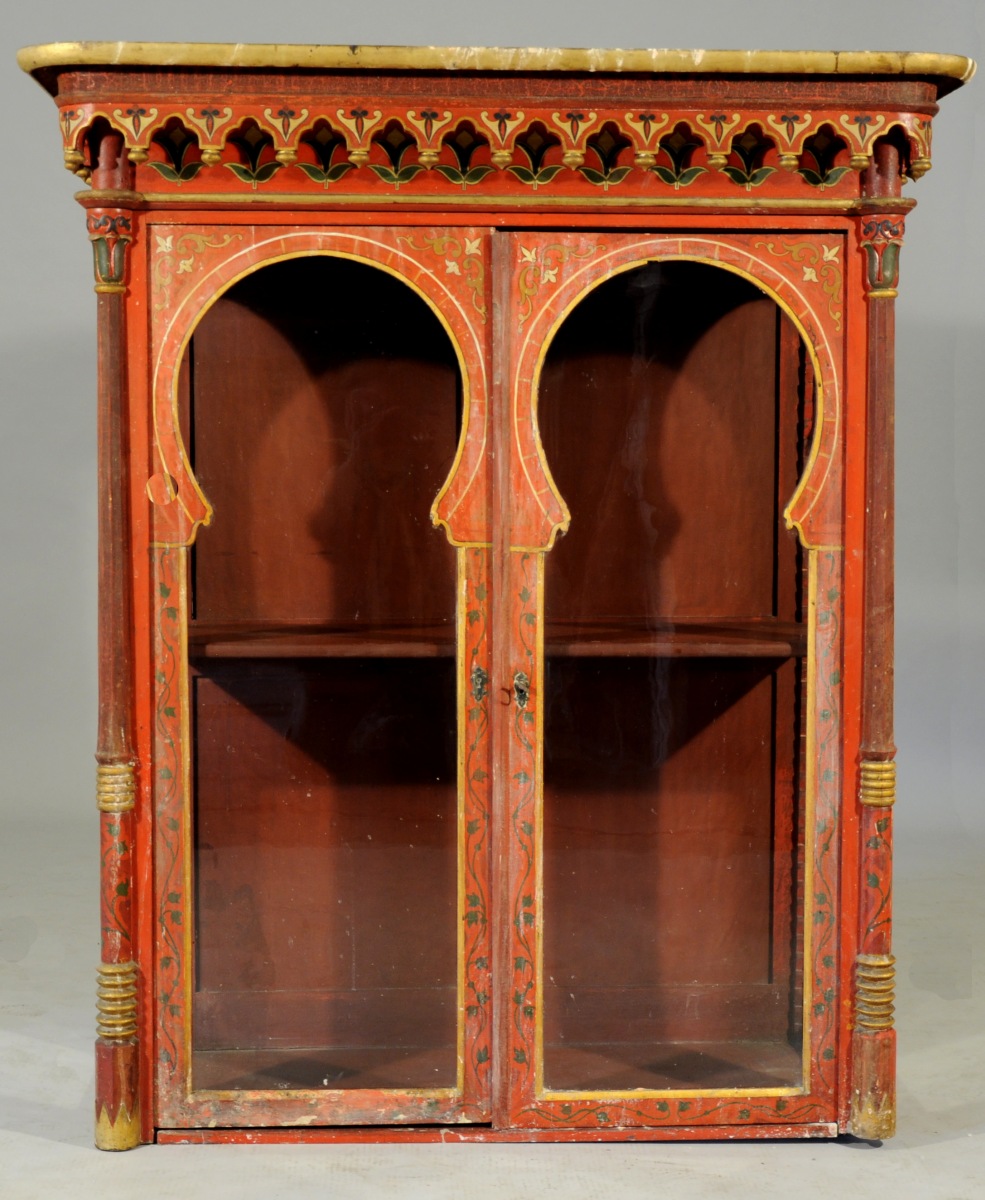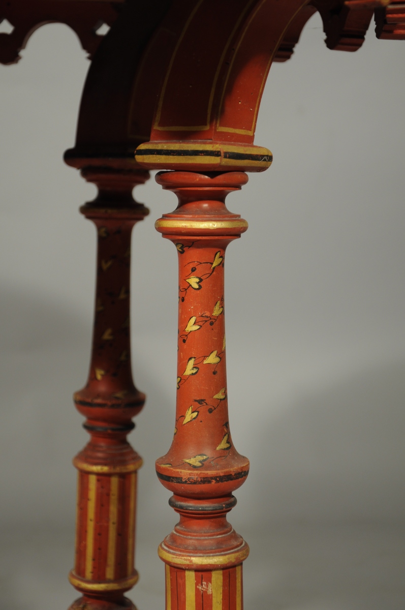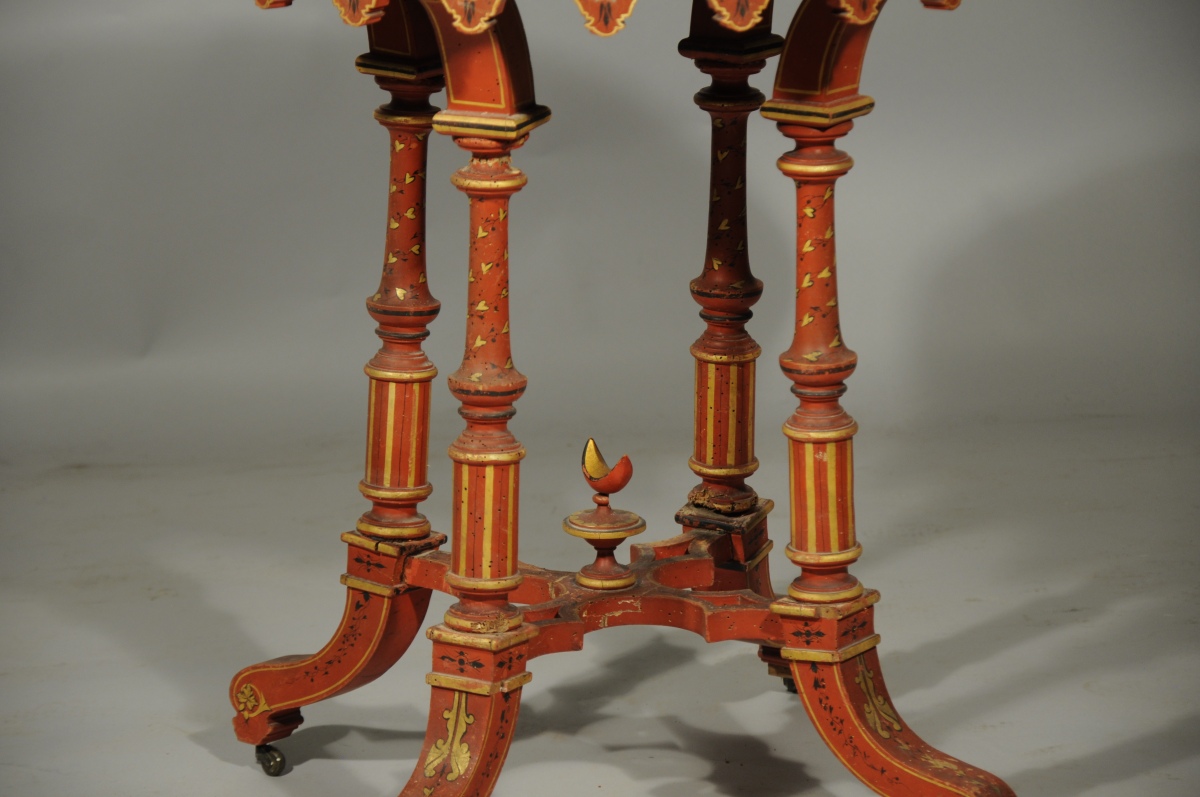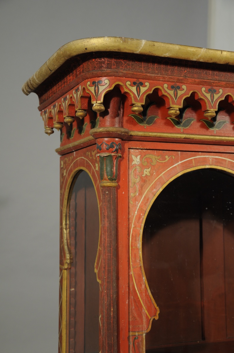 MOBILIER de SALON comprenant deux buffets, une table, quatre chaises et un lutrin, à riche décor peint de volutes et de fleurs d'esprit oriental sur fond rouge.