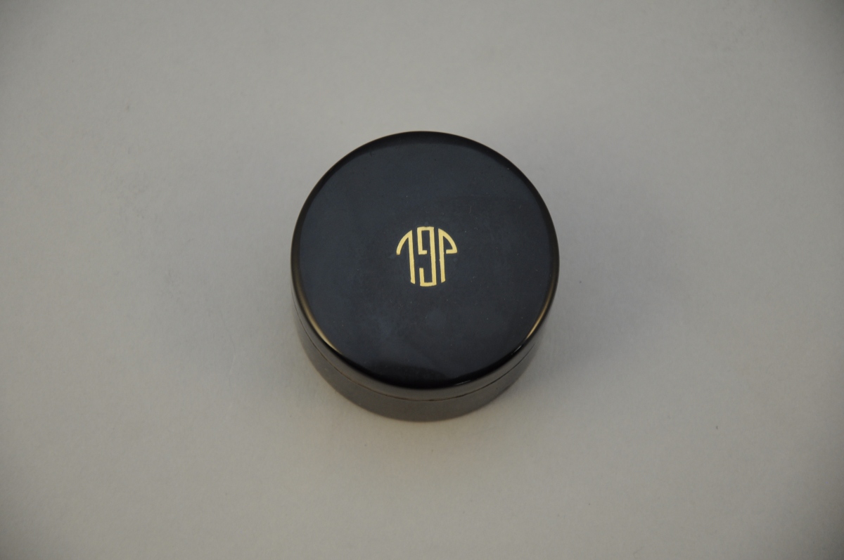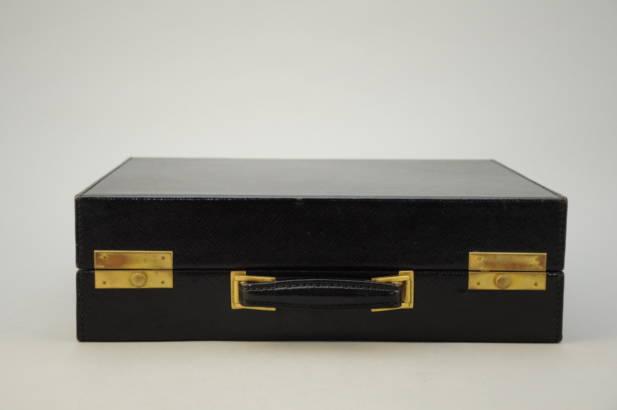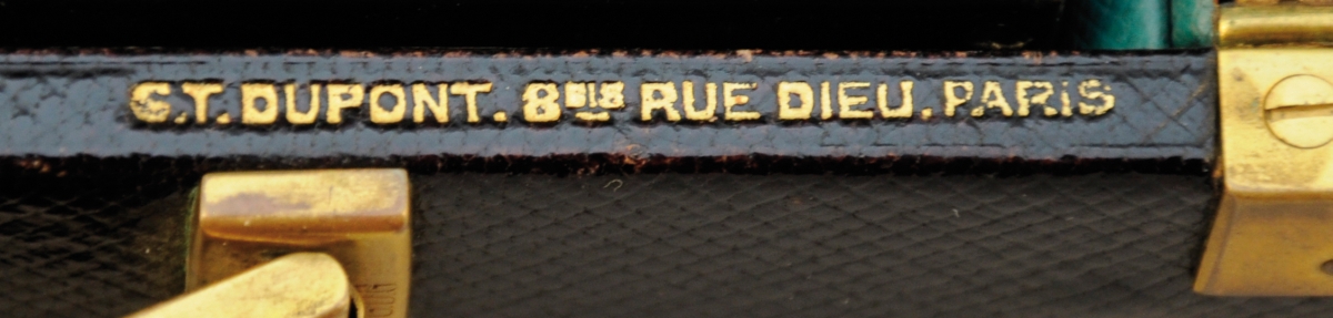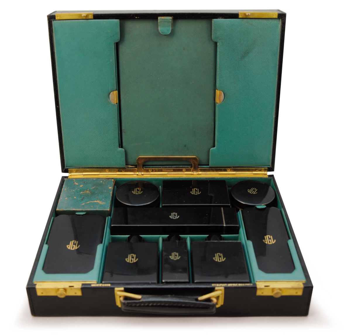 DUPONT. Mallette de voyage en cuir noir. Poignée rétractable. Fermetures en laiton. Intérieur en cuir vert compartimenté, comprenant un nécessaire de toilette laqué noir, avec flacons, boîtes, brosses, instruments de manucure, peigne et miroir. Les différents éléments sont monogrammés JGL. Signée à droite, près du fermoir.