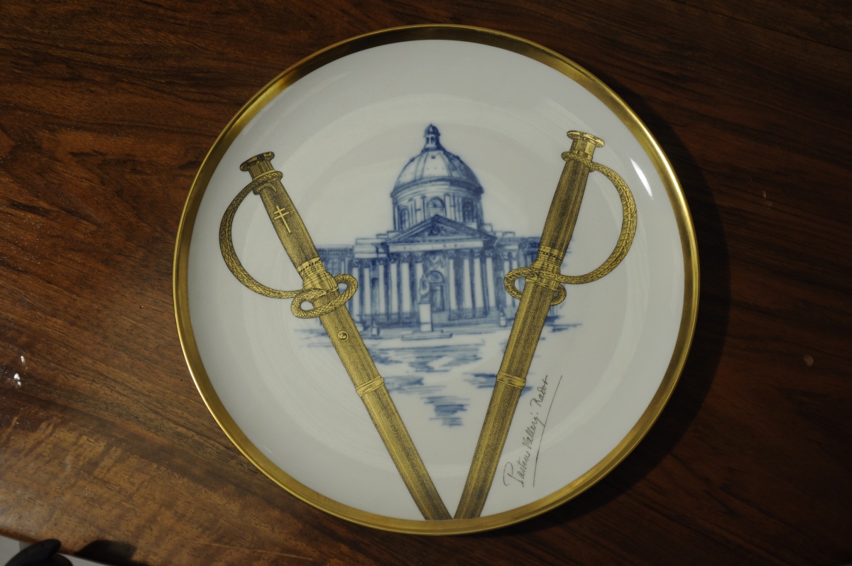 CARTIER et L. BERNARDAUD et Cie à Limoges. Neuf ASSIETTES plates en porcelaine, de la série " Au fil de l'épée académique ". Elles sont ornées de la façade de l'Institut en camaïeu bleu et, pour chacune d'elle, de l'épée dorée d'un académicien, présentée sur ses deux faces, ainsi que de la signature de cet académicien. Bordures dorées.