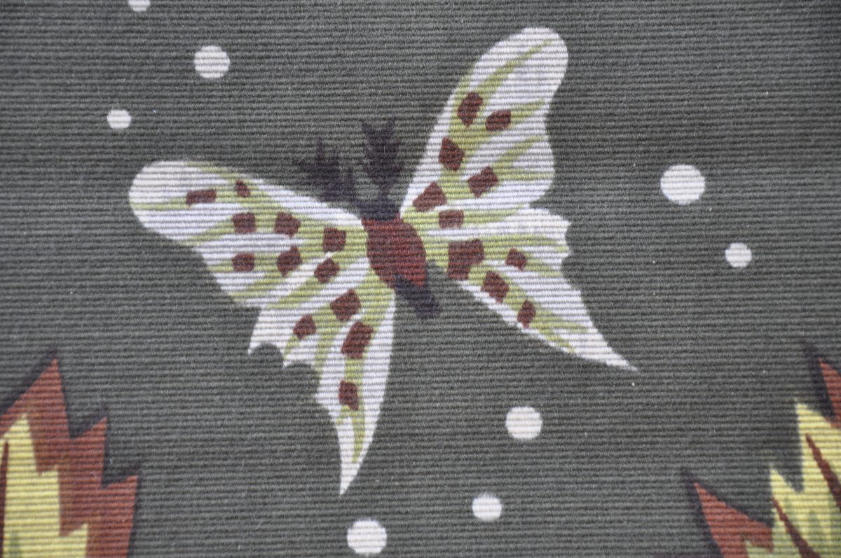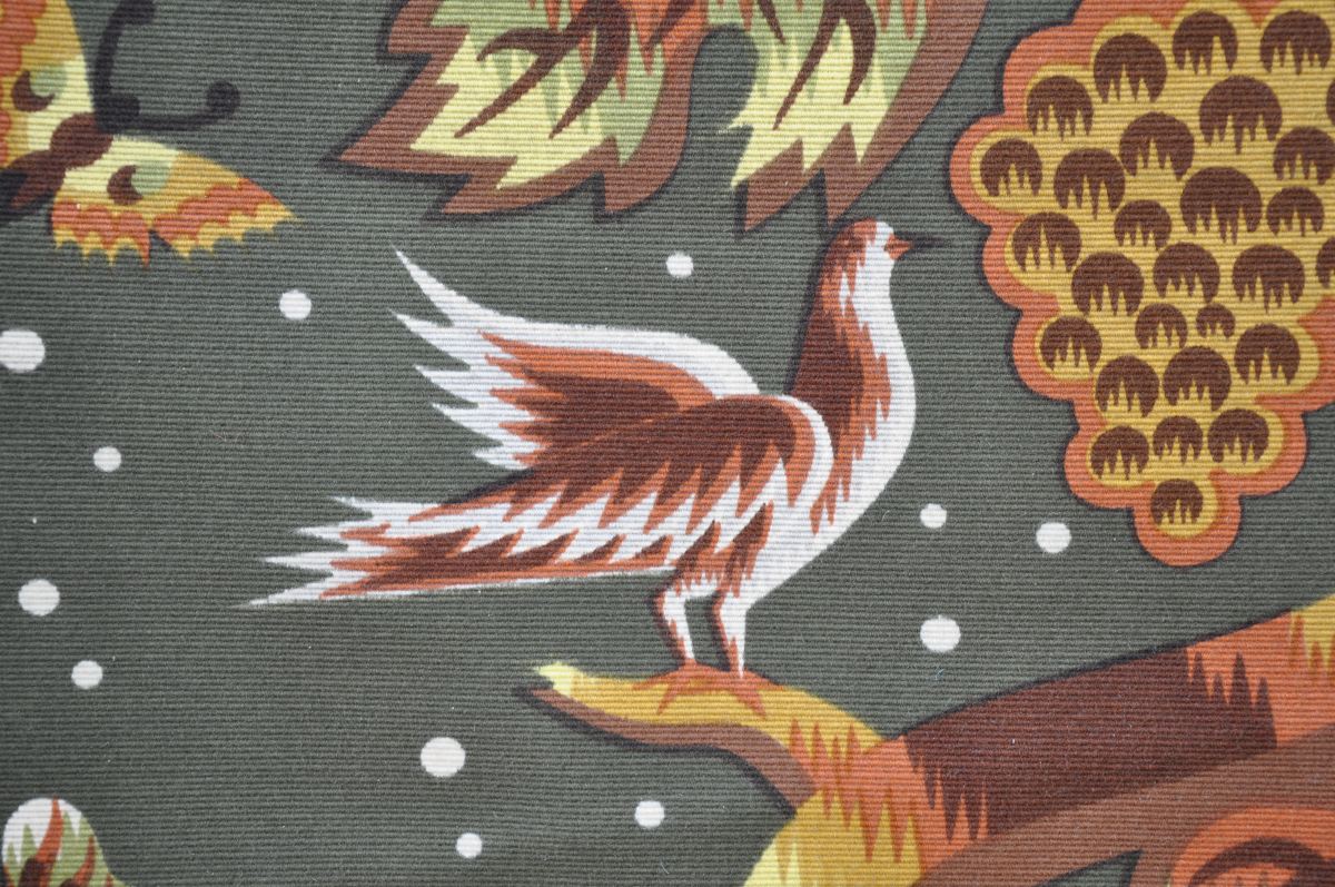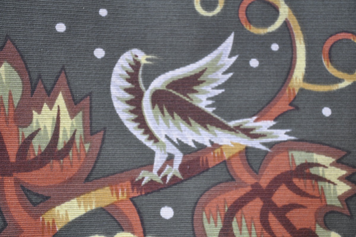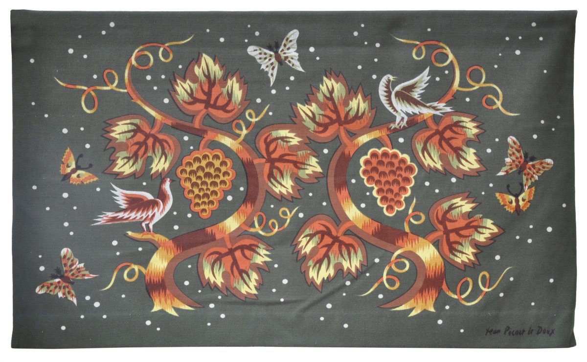 Tapisserie en laine imprimée à la main, à décor d'une treille, d'oiseaux et de papillons sur fond vert, signée en bas à droite. Éditeur: Robert Four. Composition B.1752, tombée de métier n°70. Avec signature autographe de Jean Picard Le Doux sur le bolduc. Tirage limité à cent exemplaires.