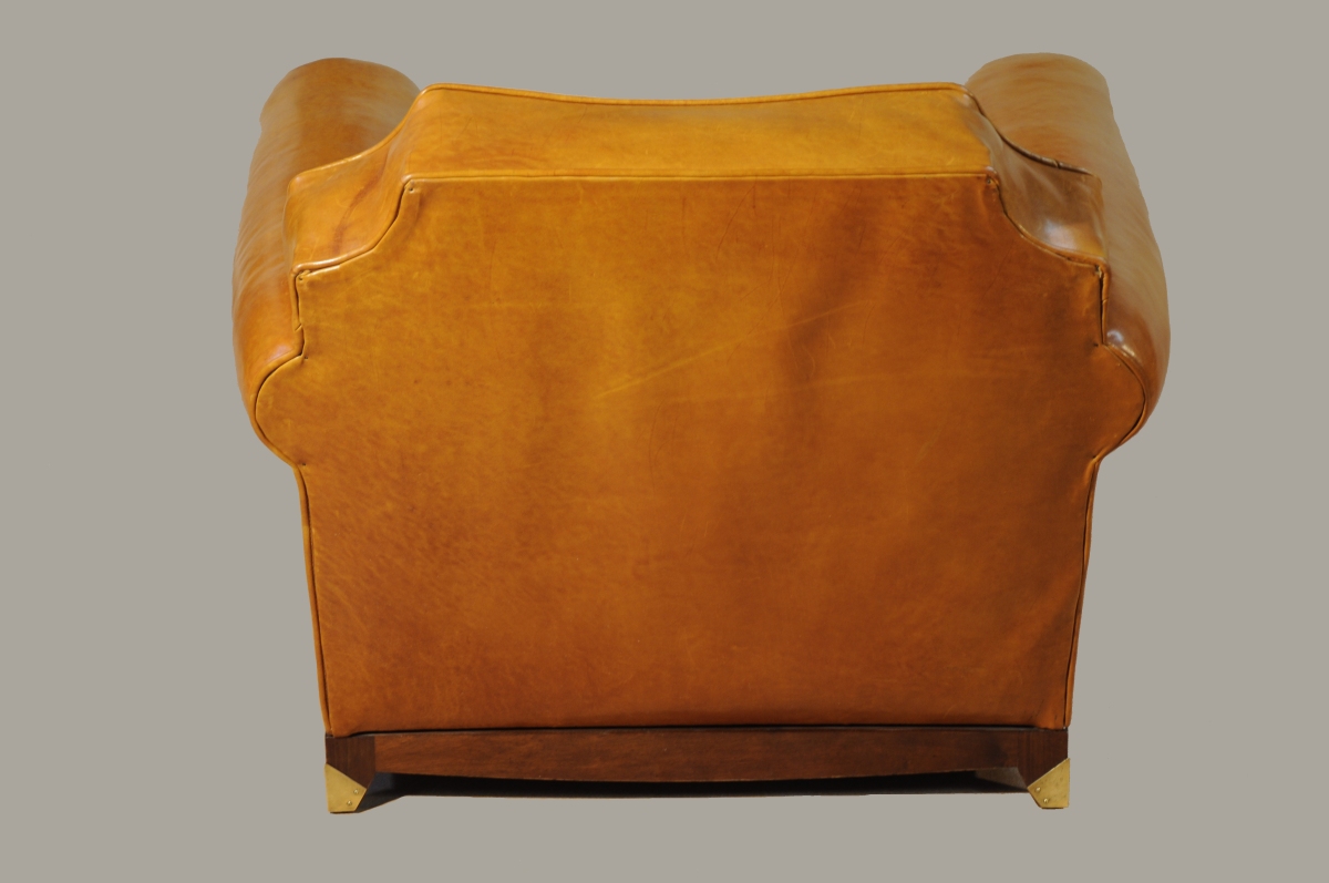 PAIRE de FAUTEUILS à dossier plat incliné. Piétement en noyer, à plaques de laiton en bout de pieds.