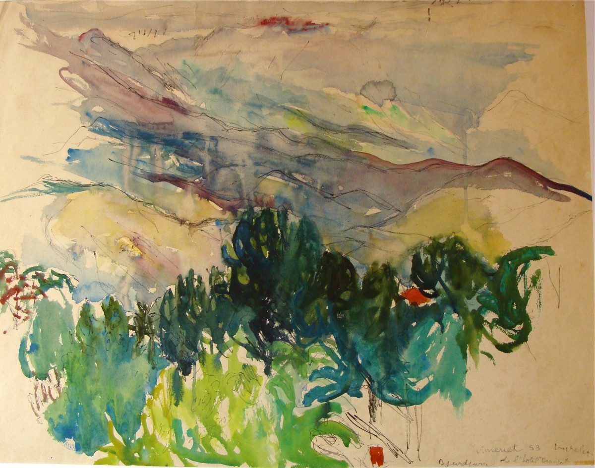 Aquarelle signée, datée et titrée en bas à droite au stylo bille noir: " Vimenet 53 " et à l'encre: " Michelet Djurdjura de l'hôtel Transat ".