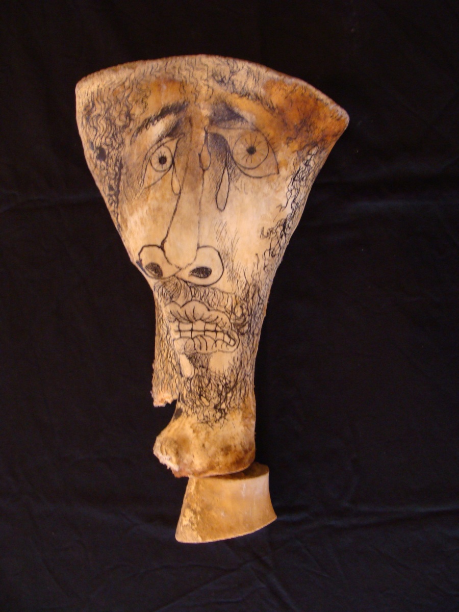 " L'homme qui pleure ".Os peint, polychrome. 40 x 25...