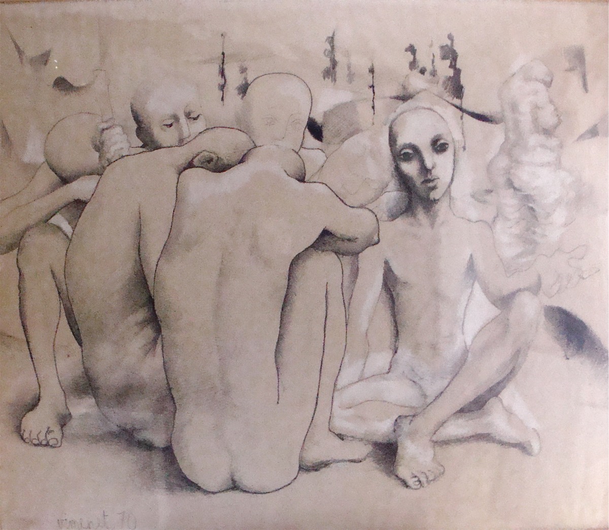 Dessin au fusain et à l'encre, rehaut de gouache signé et daté en bas à gauche à l'encre: " Vimenet 70 ".