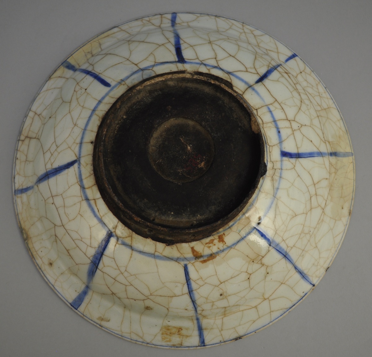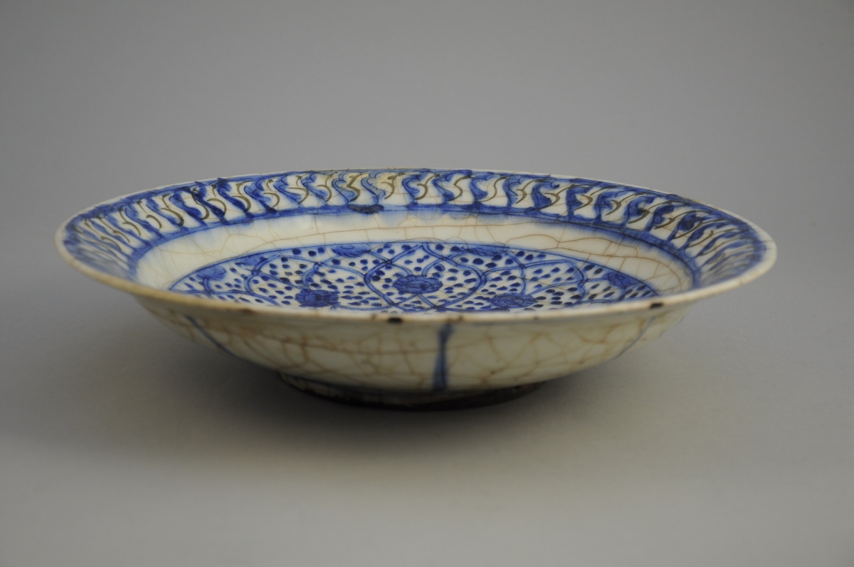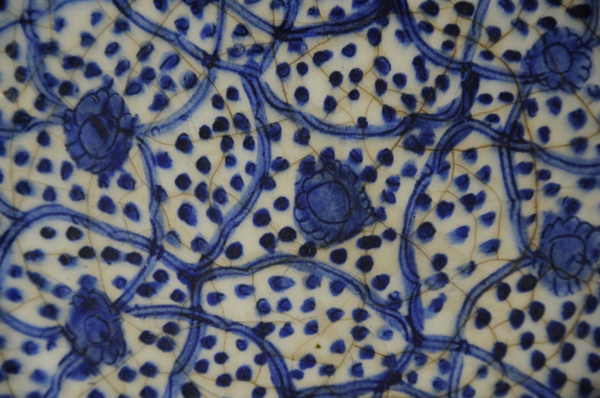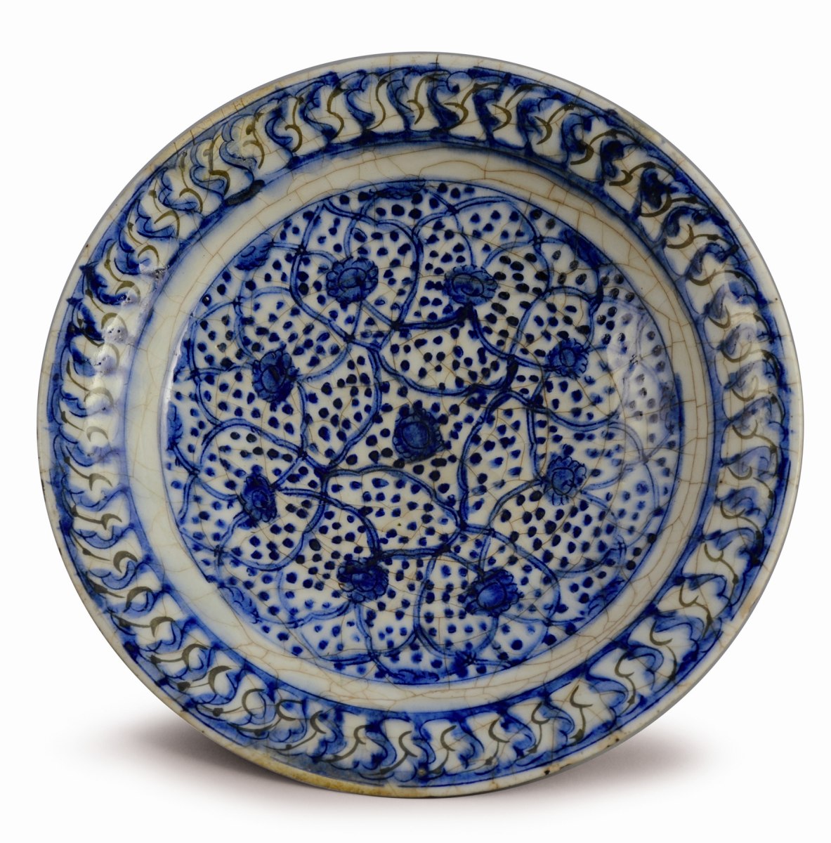 PLAT en céramique siliceuse à décor peint en bleu et noir sur fond crème, sous glaçure incolore tressaillée. Décor de résille ponctuée, scandée de rosettes.