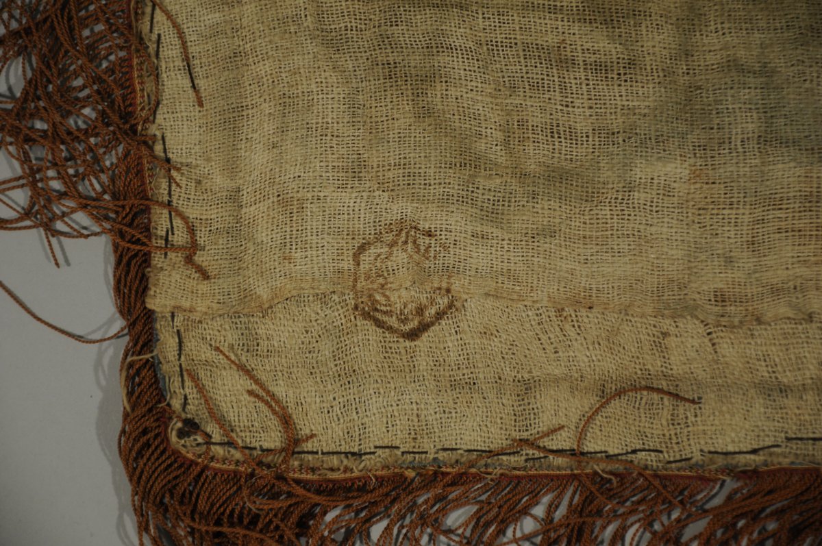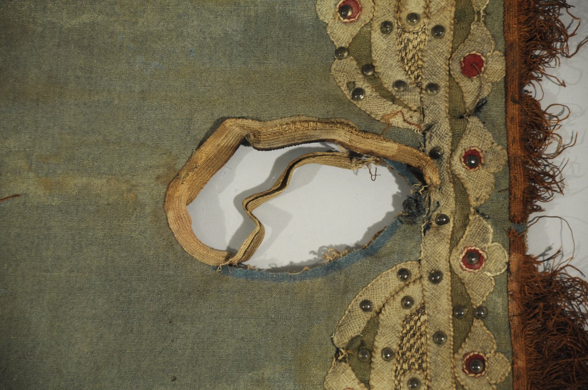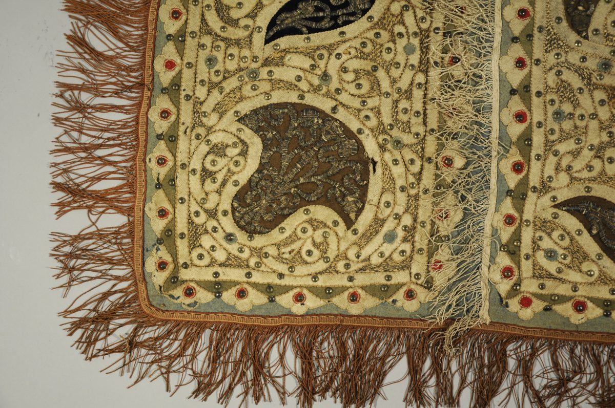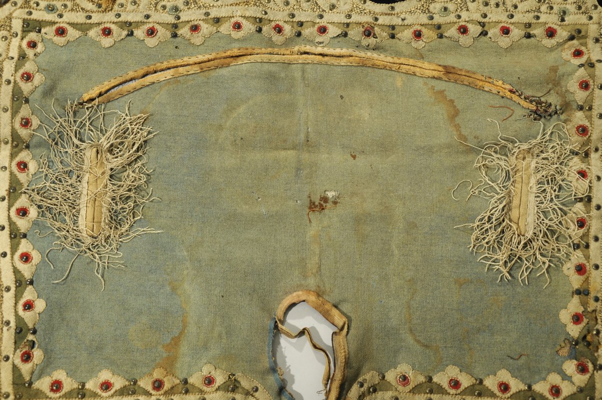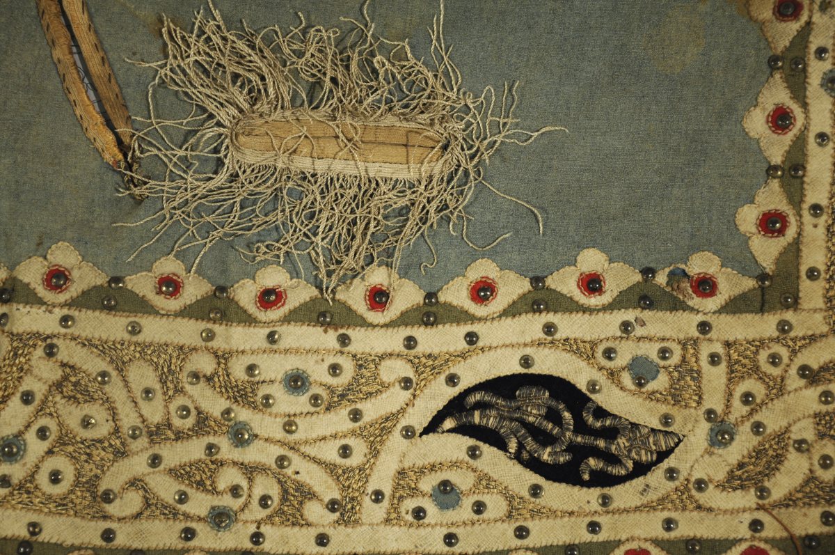 TAPIS DE SELLE en feutre à décor appliqué polychrome et brodé de fils métalliques, selon la technique kabarma, agrémenté de pastilles dorées. Décor en registres de motifs géométriques et de palmes.