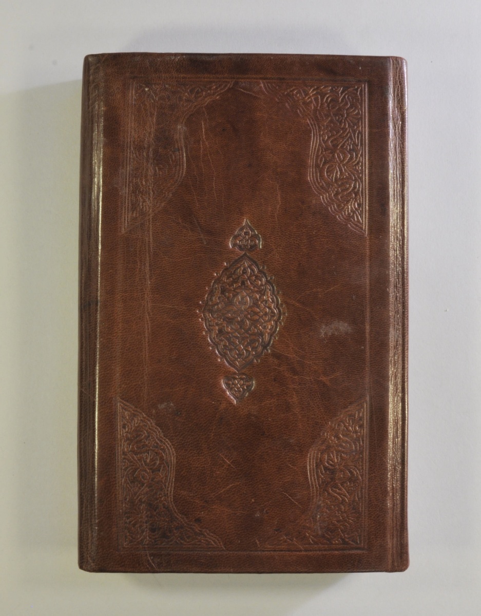 Manuscrit sur papier de 286 feuillets en écriture naskhî de 19 lignes de texte par page. Frontispice en unwân à décor polychrome et or de rinceaux fleuris et demi-palmettes à redans. Texte à l'encre noire et fuchsia assorti de nombreuses gloses. Le colophon inscrit dans un triangle doré donne le nom du copiste, Mustafâ Ibn Ibrahim et la date de 1157/1744. Reliure moderne en cuir grenat à rabat, à décor estampé d'une mandorle et d'écoinçons à rinceaux fleuris et nuages.