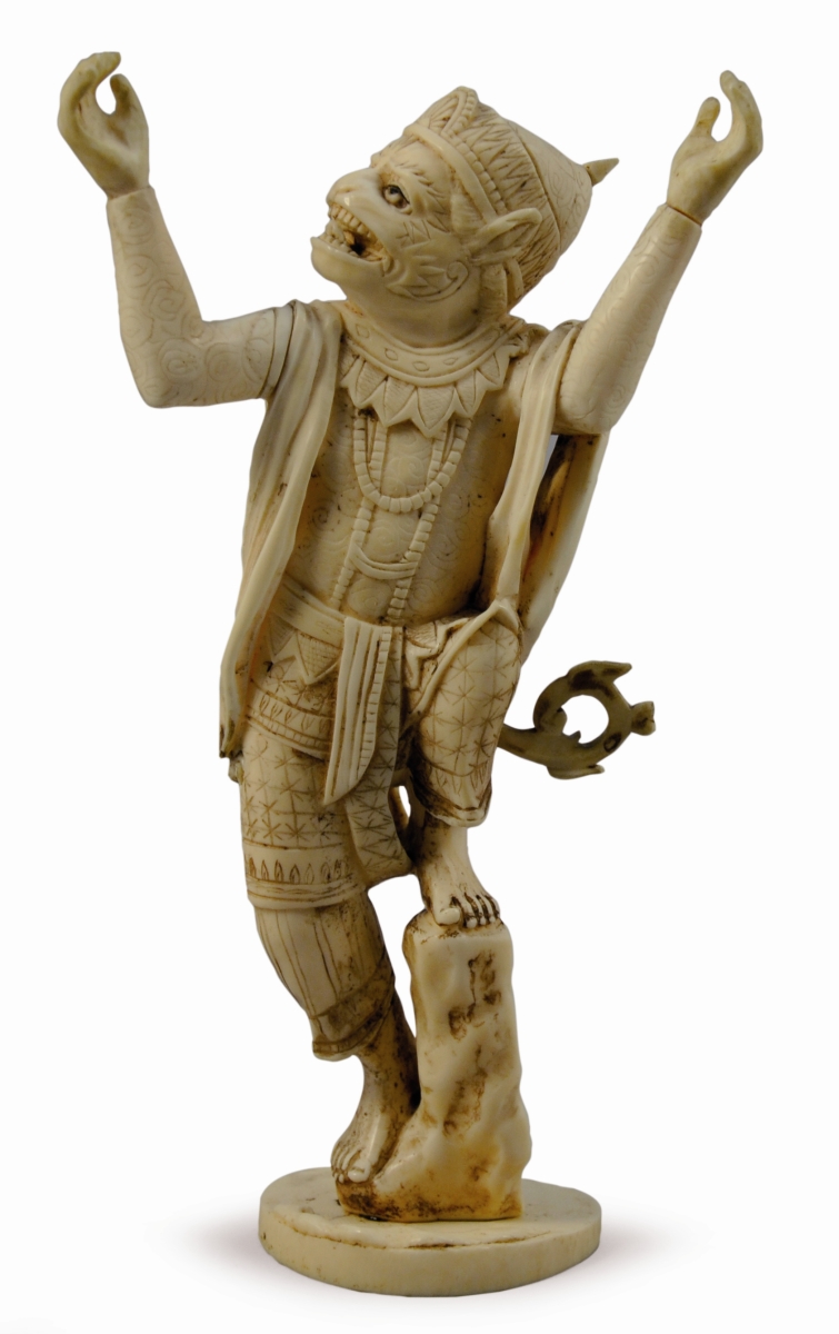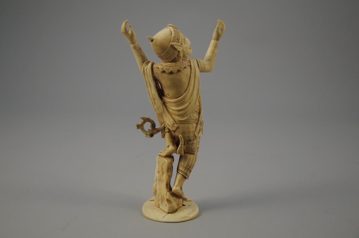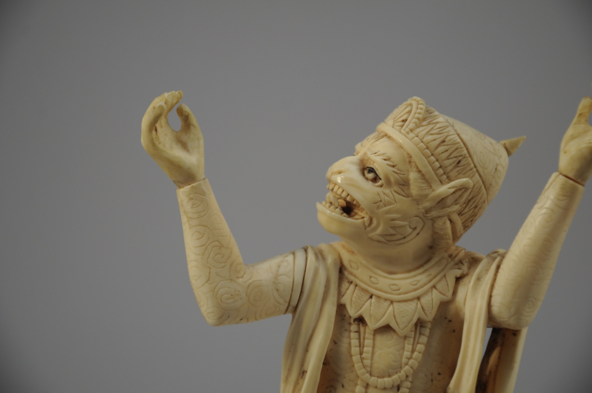 OKIMONO en ivoire à patine jaune, Hanuman debout, la jambe gauche posée sur un rocher.