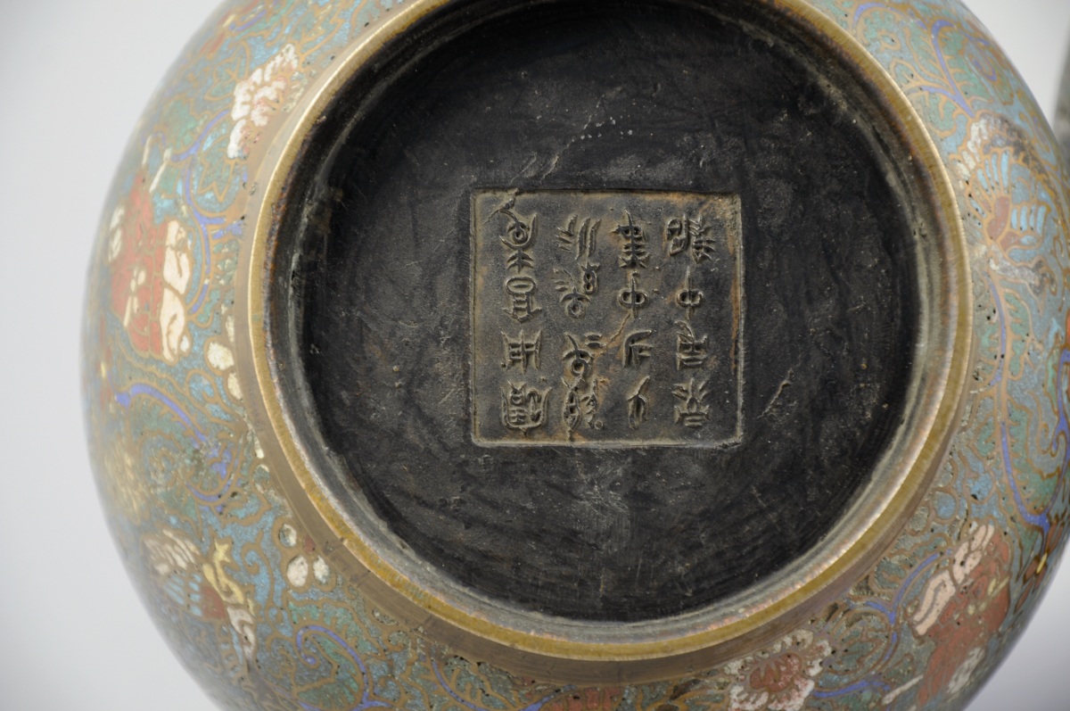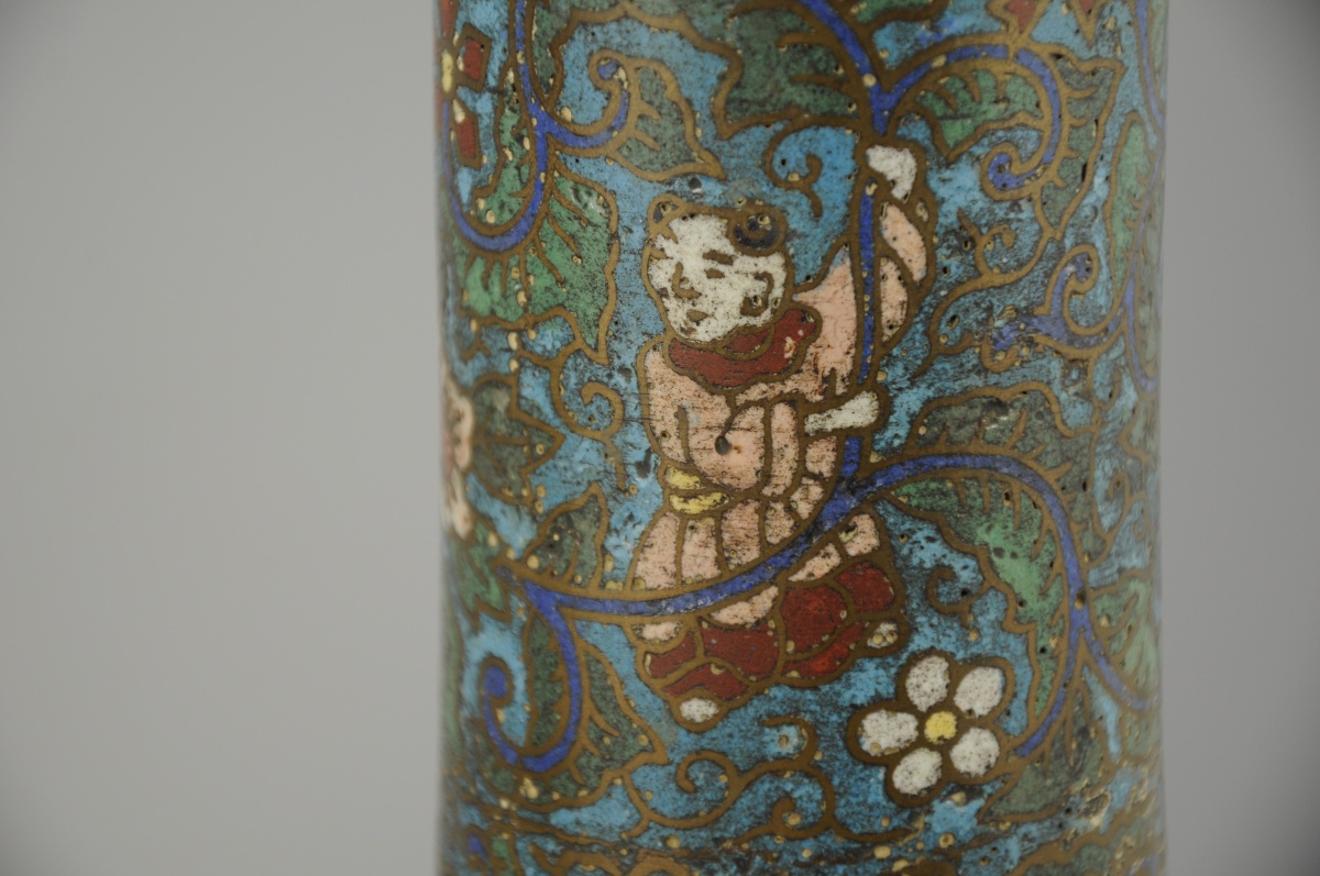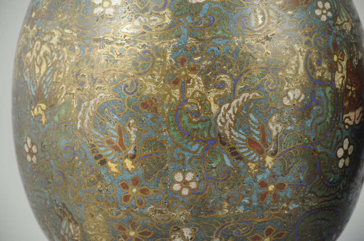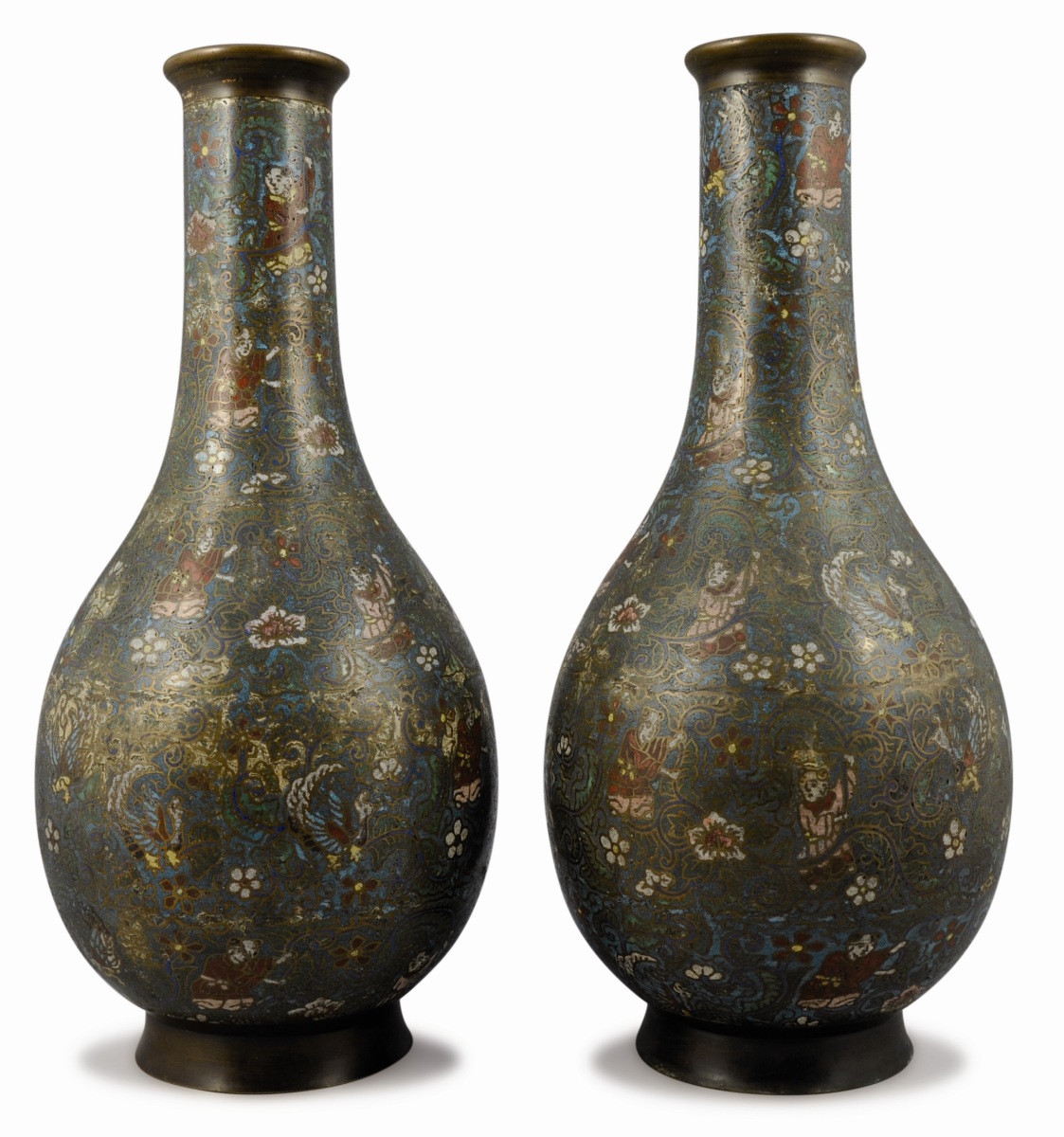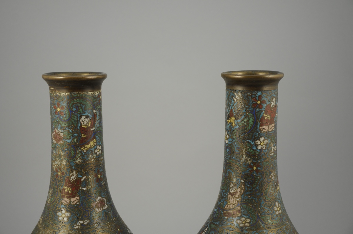 Paire de VASES bouteilles en bronze et émaux cloisonnés à décor de personnages parmi les lotus et rinceaux sur fond bleu turquoise.