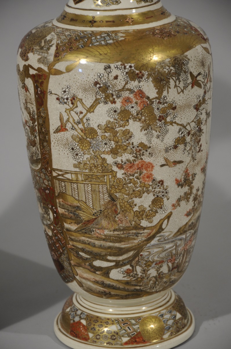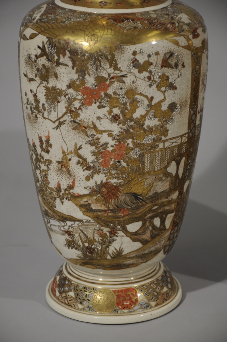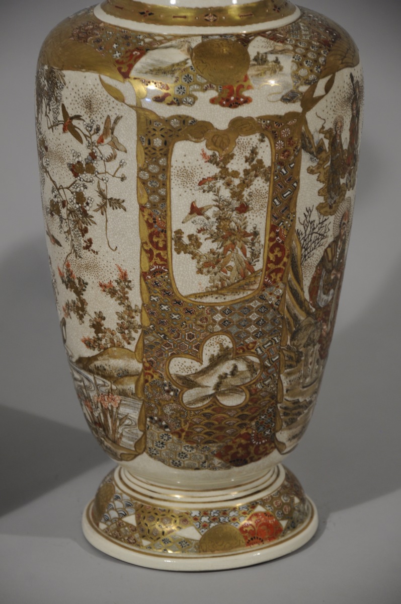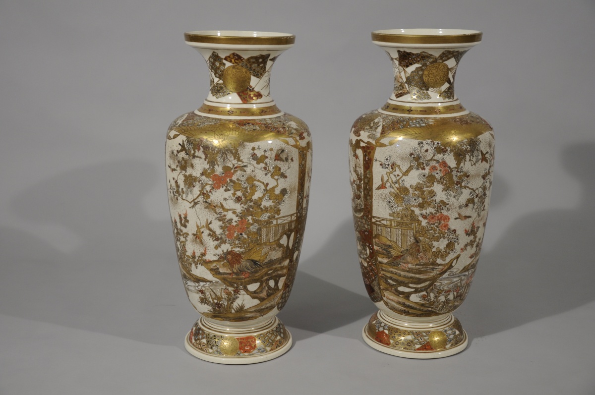 Paire de VASES balustres en faïence de Satsuma décorée en émaux polychromes et or de médaillons d'oiseaux parmi les fleurs, près d'un ruisseau et rakan sur fond de motifs de tissus.