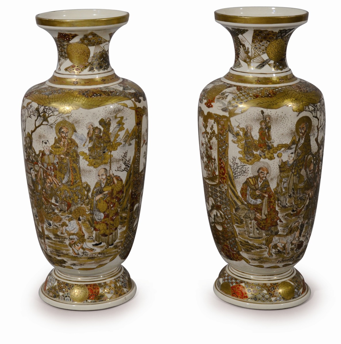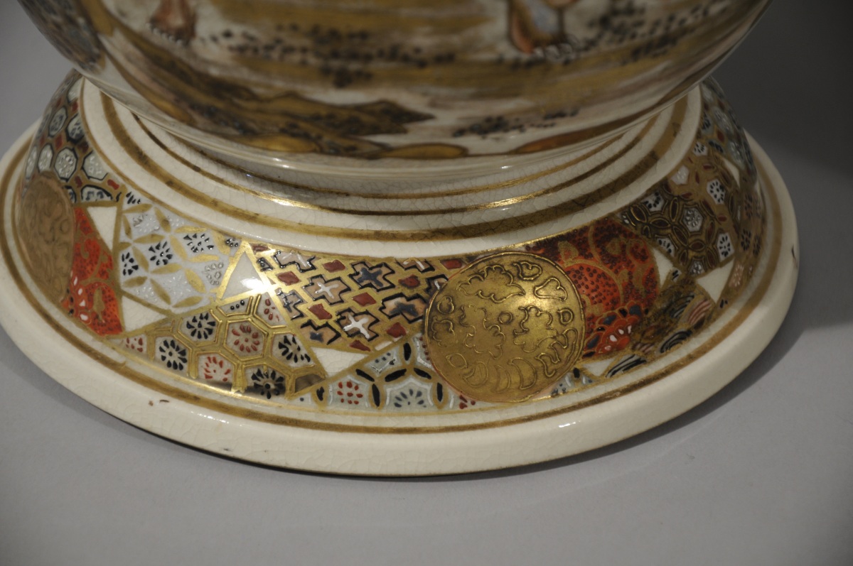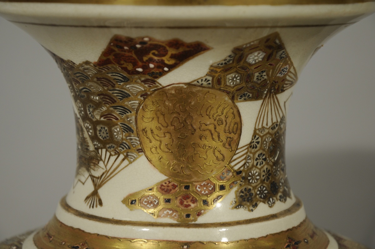 Paire de VASES balustres en faïence de Satsuma décorée en émaux polychromes et or de médaillons d'oiseaux parmi les fleurs, près d'un ruisseau et rakan sur fond de motifs de tissus.