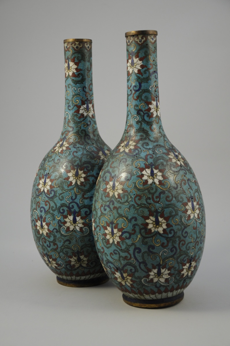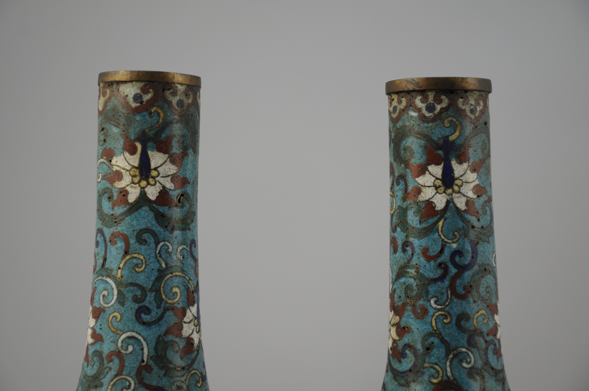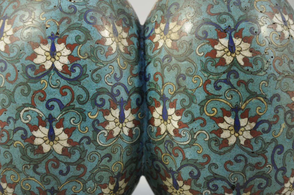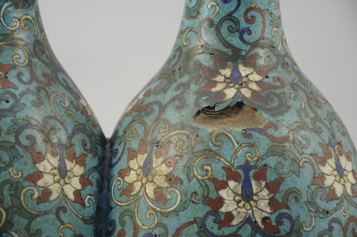 DOUBLE VASE BOUTEILLES en bronze doré et émaux cloisonnés à décor de lotus et rinceaux sur fond bleu turquoise.