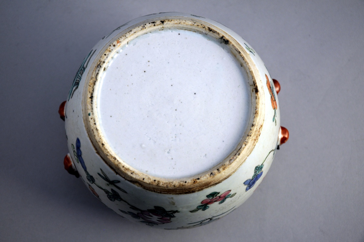 PAIRE de POTS couverts en porcelaine décorée en émaux polychromes de fleurs de pivoines et feuillage. Le bord décoré d'une frise de grecques. Couvercle en forme de chimère.