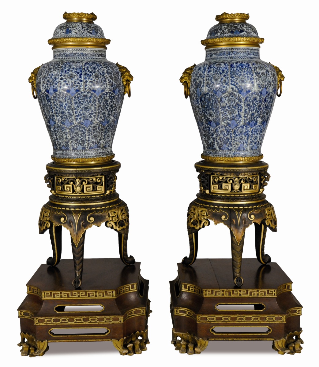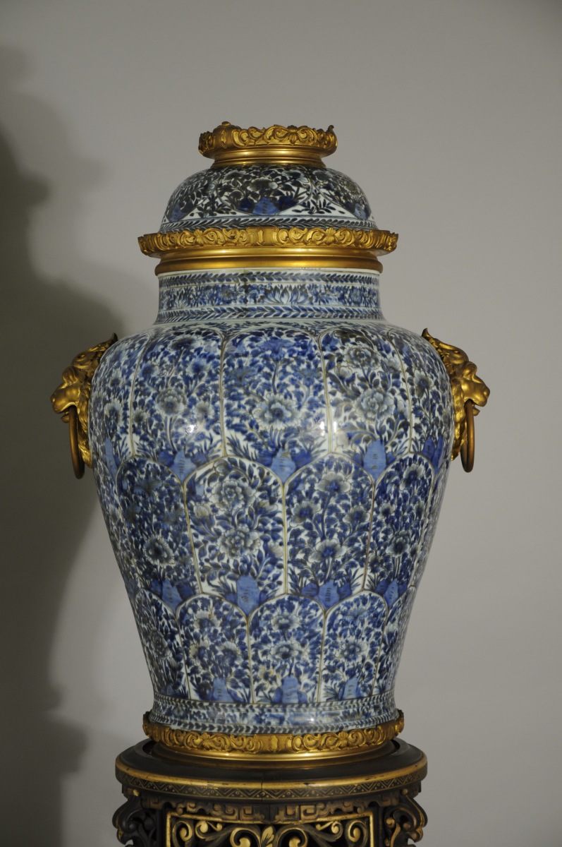 Importante PAIRE de POTICHES couvertes en porcelaine décorée en bleu sous couverte et surdécorée en émail or de médaillons successifs de pivoines sortant de rochers percés parmi les rinceaux et feuillage. Le col décoré d'une frise de feuillage stylisé. (Fonds et couvercles percés).