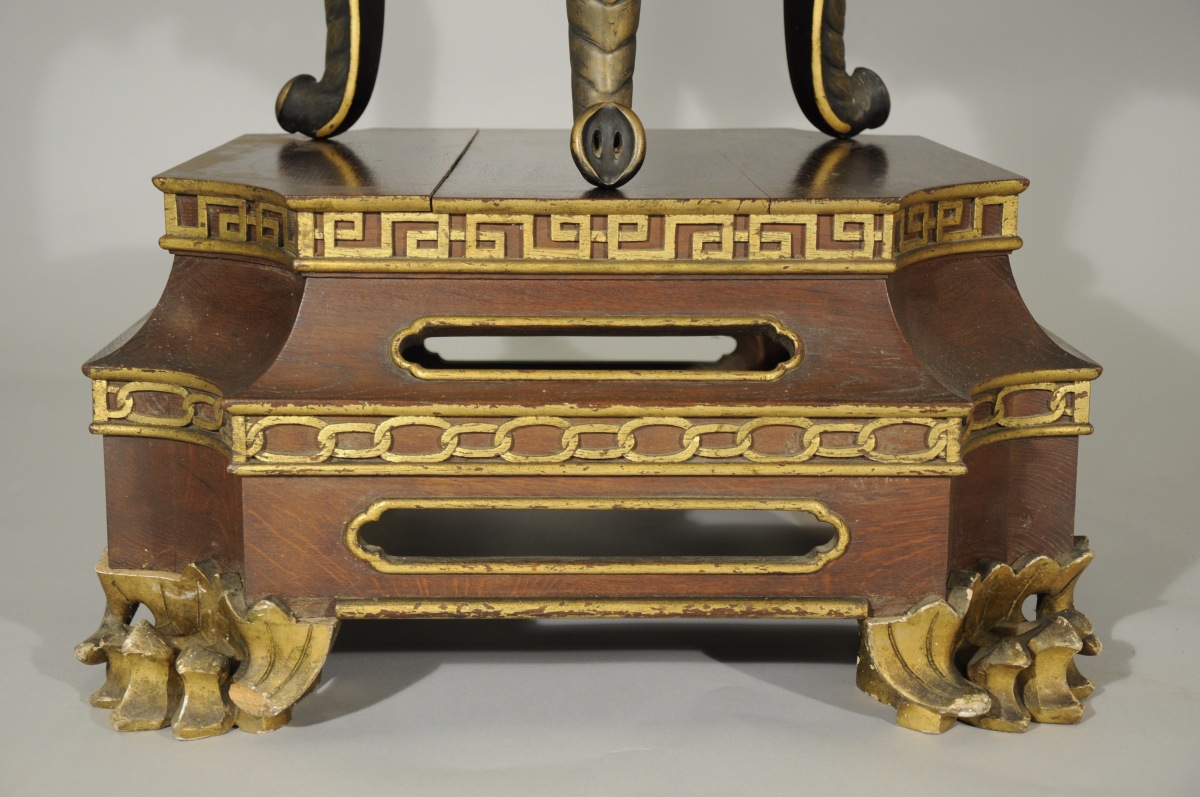 Monture en bronze doré. Piétement en bois en forme de trois trompes d'éléphants, reposant sur une base carrée en bois exotique ajouré et sculpté, se terminant par des griffes dorées.