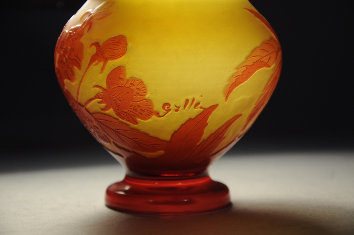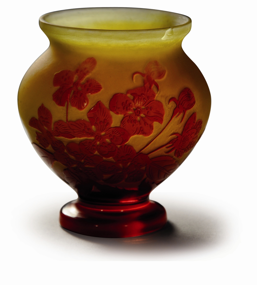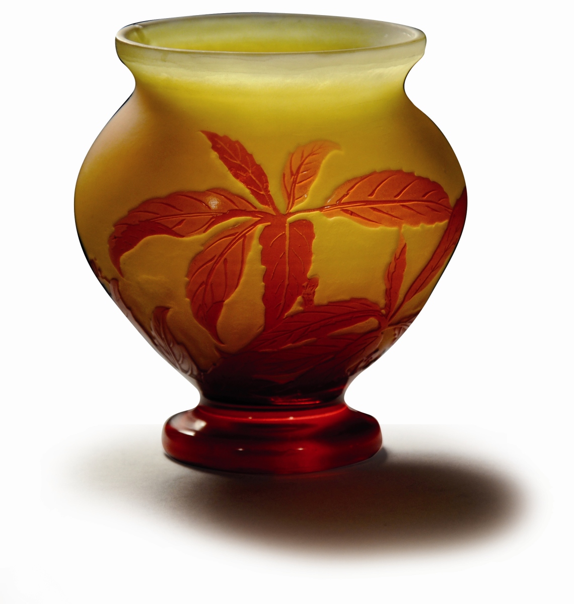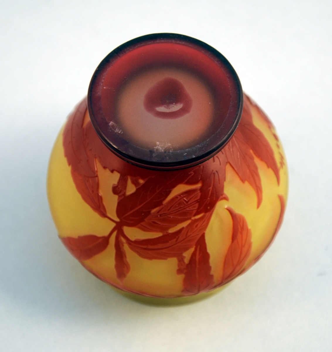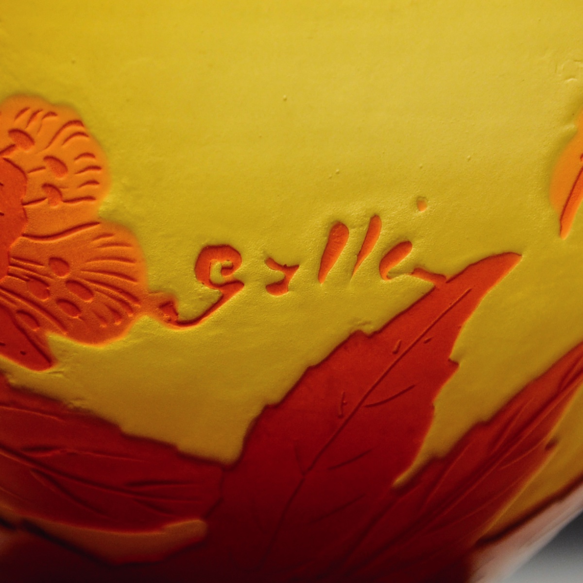 VASE globulaire à piédouche en verre multicouches, gravé à l'acide. Décor de fleurs et feuilles rouges sur fond opalescent jaune. Signé "Gallé".