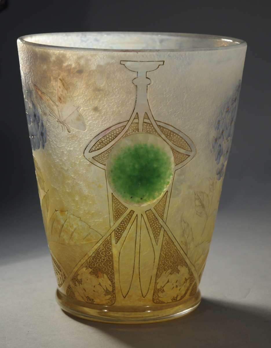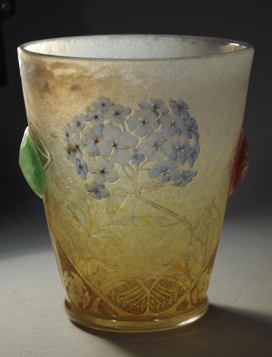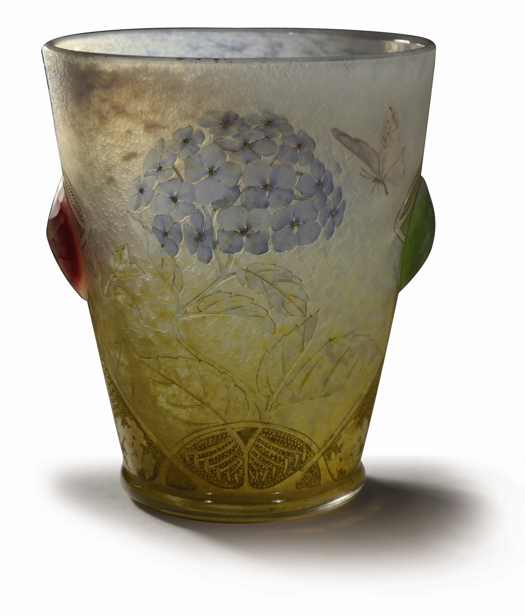 DAUM NANCY. VASE circulaire en verre soufflé-moulé, à décor gravé à l'acide et à la roue d'hortensias émaillés au naturel, d'un papillon et de motifs Art nouveau. Anses en application, à facettes, l'une à fond vert et l'autre à fond rouge. Rehauts dorés. Signé en lettres dorées au revers: "Daum - Nancy" avec une croix de Lorraine, et marque gravée "hortensias".