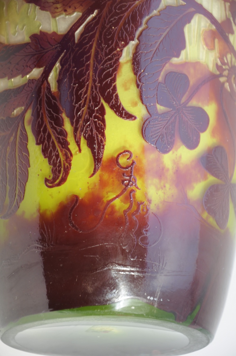 VASE oblong en verre multicouches, gravé à l'acide avec reprises à la meule. Décor de fougères et de trèfles sur fond opalescent orangé. Signé "Gallé".